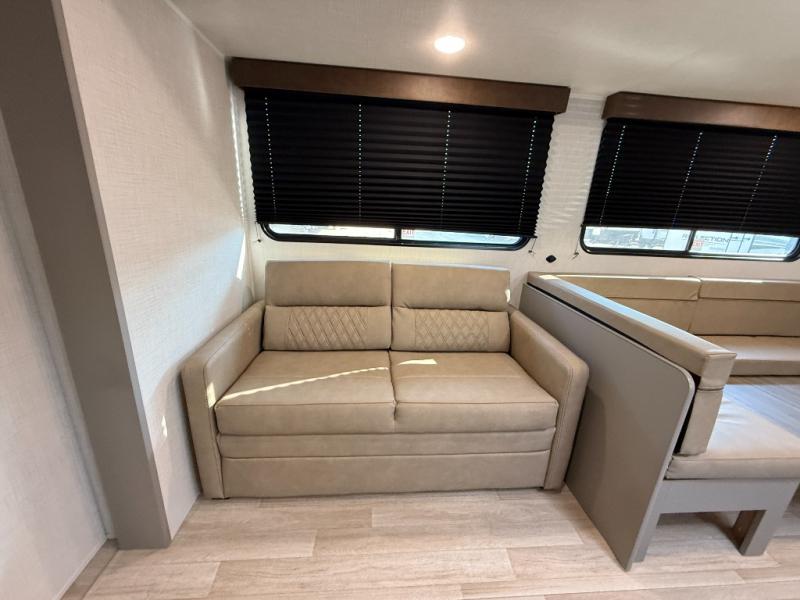 A large slide, front private bedroom, and double-size bunks make this Hideout Sport Double Axle the ultimate travel trailer! You will enjoy a walk-around queen bed in the bedroom plus dual closets and nightstands for your things. The full bath is towards the back and beside the bunks for easy nighttime use, and there is a pass-through storage outside for your gear. Head to the kitchen to prepare lunch on the cooktop, then dine at the U-shaped dinette and sofa within the large slide. If the weather is nice, you might just want to cook outdoors on the outside kitchen under the 18' power awning!