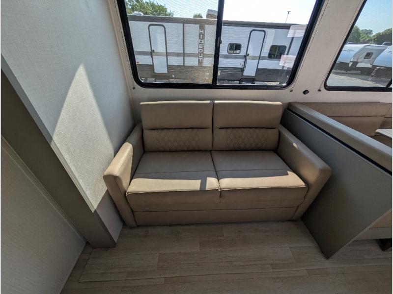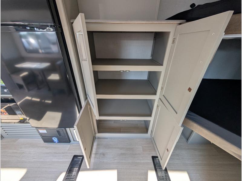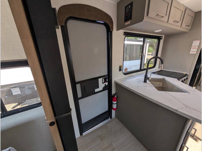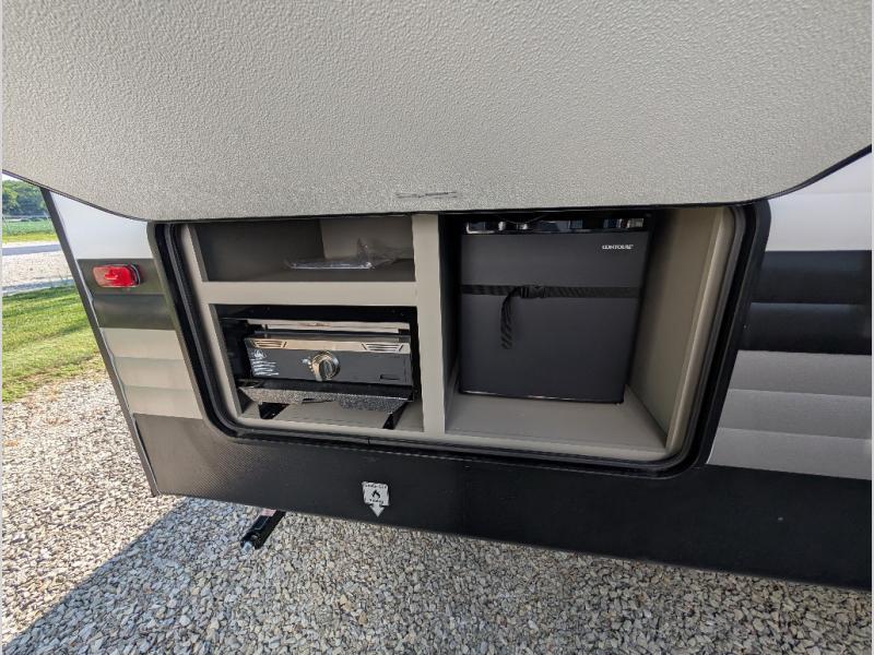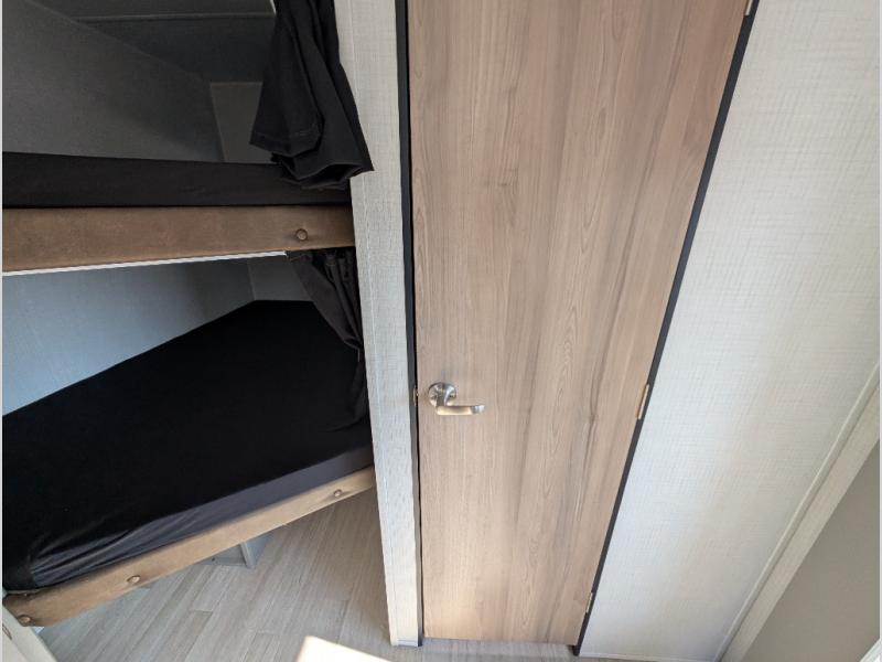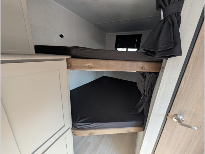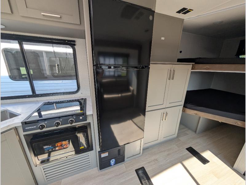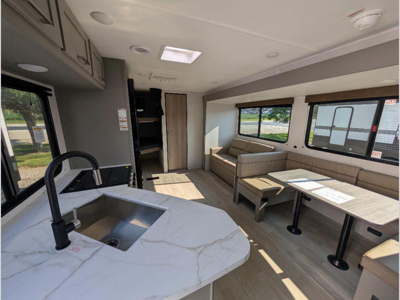 A large slide, front private bedroom, and double-size bunks make this Hideout Sport Double Axle the ultimate travel trailer! You will enjoy a walk-around queen bed in the bedroom plus dual closets and nightstands for your things. The full bath is towards the back and beside the bunks for easy nighttime use, and there is a pass-through storage outside for your gear. Head to the kitchen to prepare lunch on the cooktop, then dine at the U-shaped dinette and sofa within the large slide. If the weather is nice, you might just want to cook outdoors on the outside kitchen under the 18' power awning!