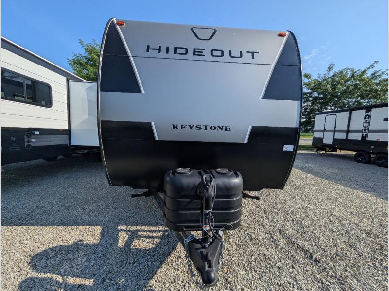 With any Hideout Sport travel trailer by Keystone you will enjoy simplified camping solutions that won't break the bank! Each model is constructed with a durable AlphaPly TPO roof membrane tinted safety glass windows, and an I-beam frame. There are power tongue jacks and heavy duty stabilizer jacks that will make it easier than ever to hitch up and go. An XL entry assist handle will also provide convenience, along with a power awning that will provide much wanted shade during the day. You will feel right at home with stylish decor, blackout night shades, and cozy bed with storage underneath!