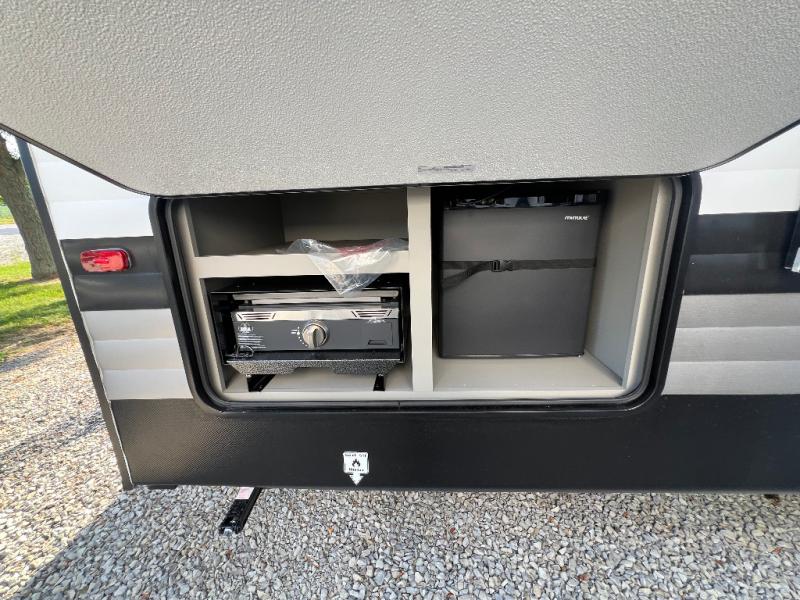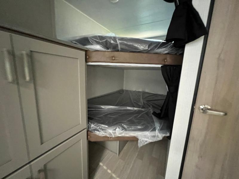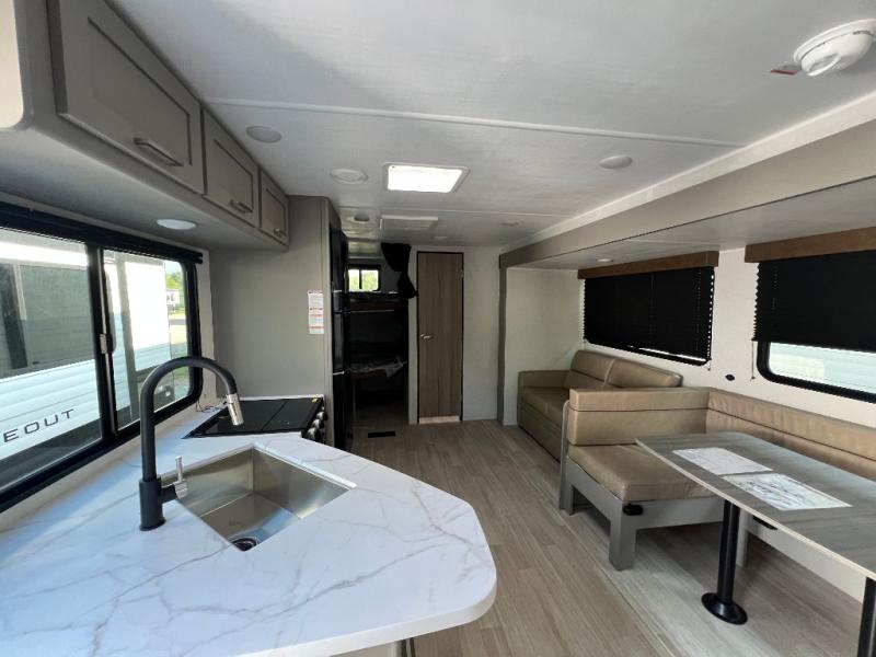 A large slide, front private bedroom, and double-size bunks make this Hideout Sport Double Axle the ultimate travel trailer! You will enjoy a walk-around queen bed in the bedroom plus dual closets and nightstands for your things. The full bath is towards the back and beside the bunks for easy nighttime use, and there is a pass-through storage outside for your gear. Head to the kitchen to prepare lunch on the cooktop, then dine at the U-shaped dinette and sofa within the large slide. If the weather is nice, you might just want to cook outdoors on the outside kitchen under the 18' power awning!