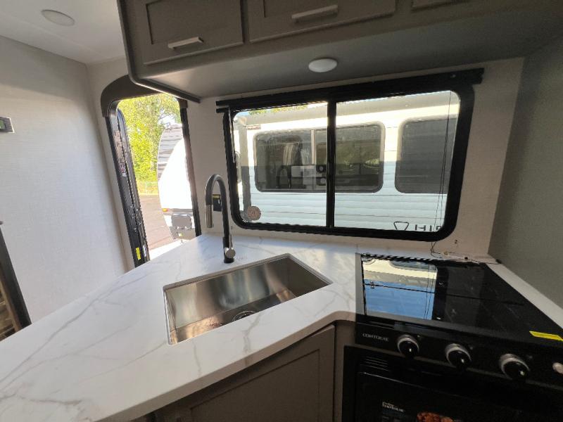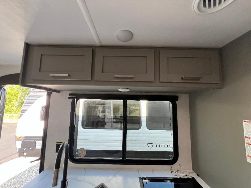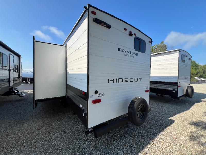 With any Hideout Sport travel trailer by Keystone you will enjoy simplified camping solutions that won't break the bank! Each model is constructed with a durable AlphaPly TPO roof membrane tinted safety glass windows, and an I-beam frame. There are power tongue jacks and heavy duty stabilizer jacks that will make it easier than ever to hitch up and go. An XL entry assist handle will also provide convenience, along with a power awning that will provide much wanted shade during the day. You will feel right at home with stylish decor, blackout night shades, and cozy bed with storage underneath!