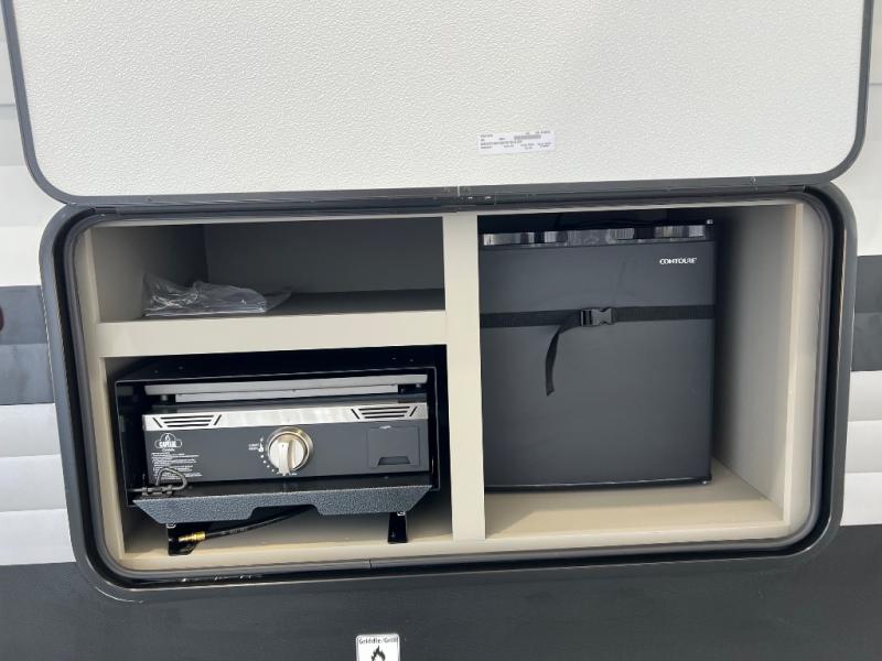 A large slide, front private bedroom, and double-size bunks make this Hideout Sport Double Axle the ultimate travel trailer! You will enjoy a walk-around queen bed in the bedroom plus dual closets and nightstands for your things. The full bath is towards the back and beside the bunks for easy nighttime use, and there is a pass-through storage outside for your gear. Head to the kitchen to prepare lunch on the cooktop, then dine at the U-shaped dinette and sofa within the large slide. If the weather is nice, you might just want to cook outdoors on the outside kitchen under the 18' power awning!