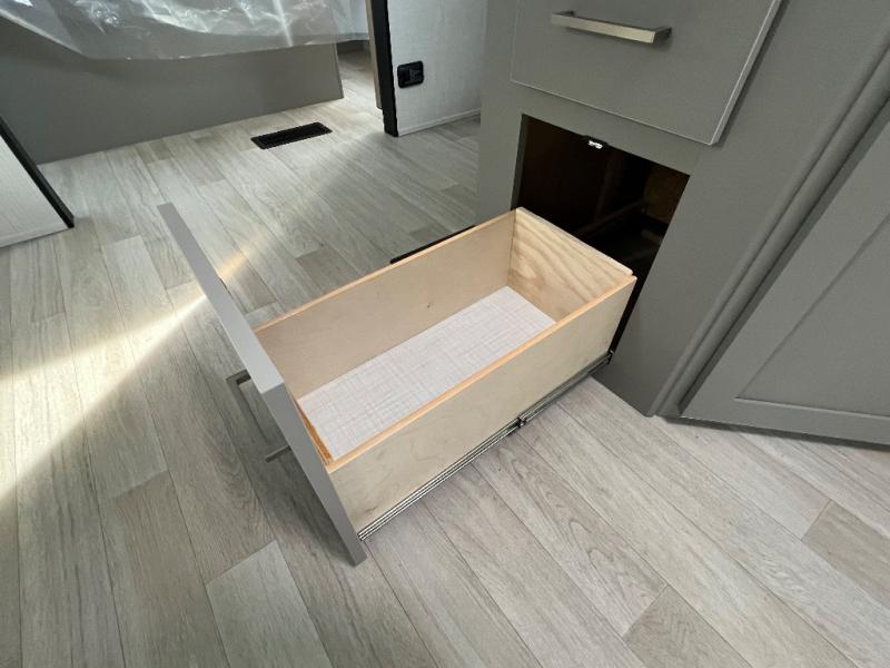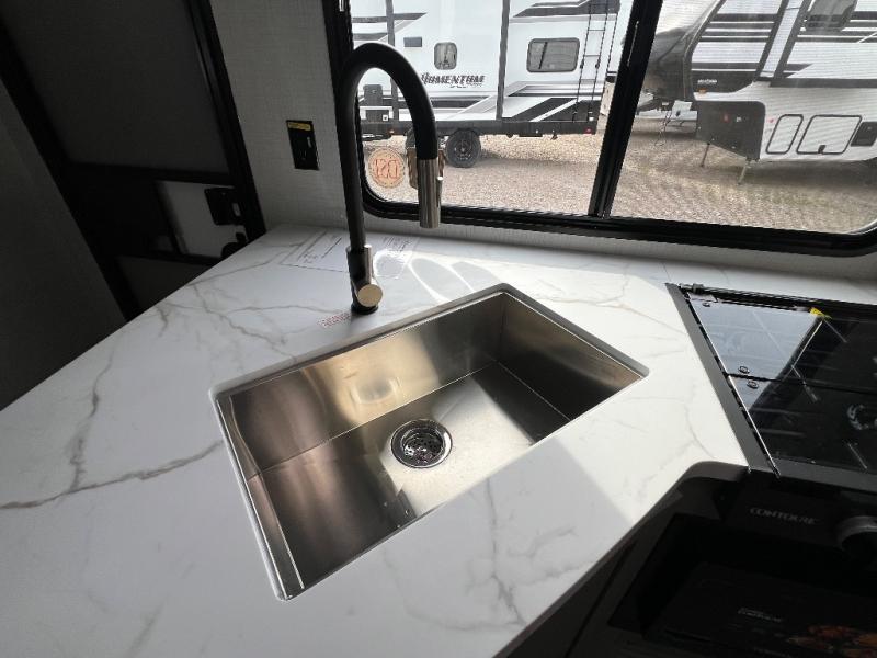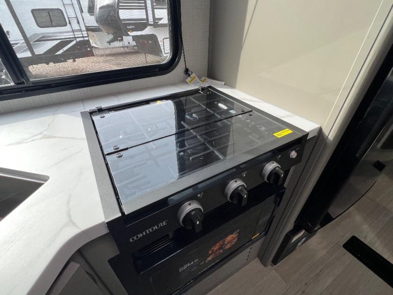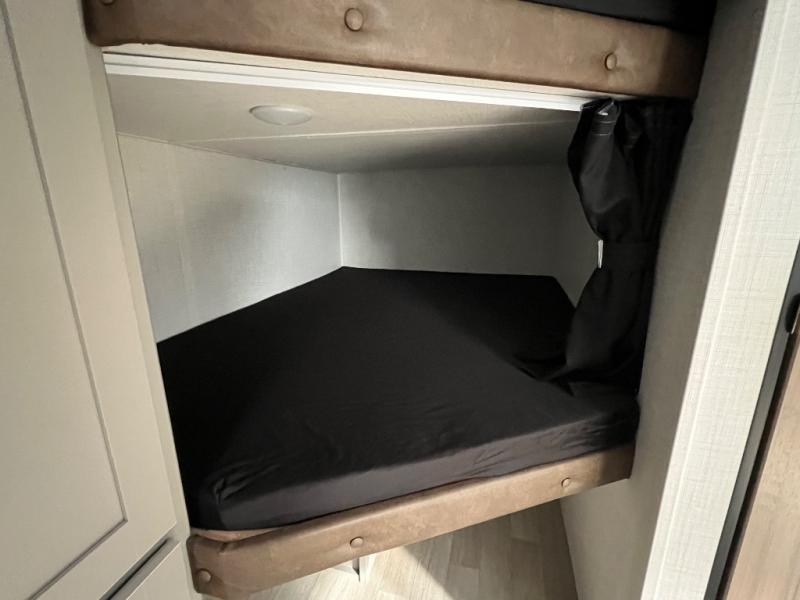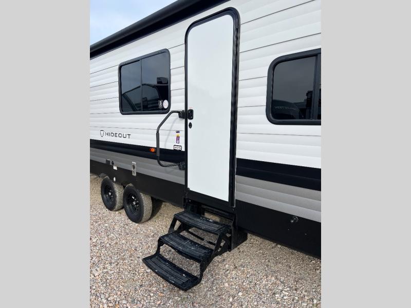 A large slide, front private bedroom, and double-size bunks make this Hideout Sport Double Axle the ultimate travel trailer! You will enjoy a walk-around queen bed in the bedroom plus dual closets and nightstands for your things. The full bath is towards the back and beside the bunks for easy nighttime use, and there is a pass-through storage outside for your gear. Head to the kitchen to prepare lunch on the cooktop, then dine at the U-shaped dinette and sofa within the large slide. If the weather is nice, you might just want to cook outdoors on the outside kitchen under the 18' power awning!