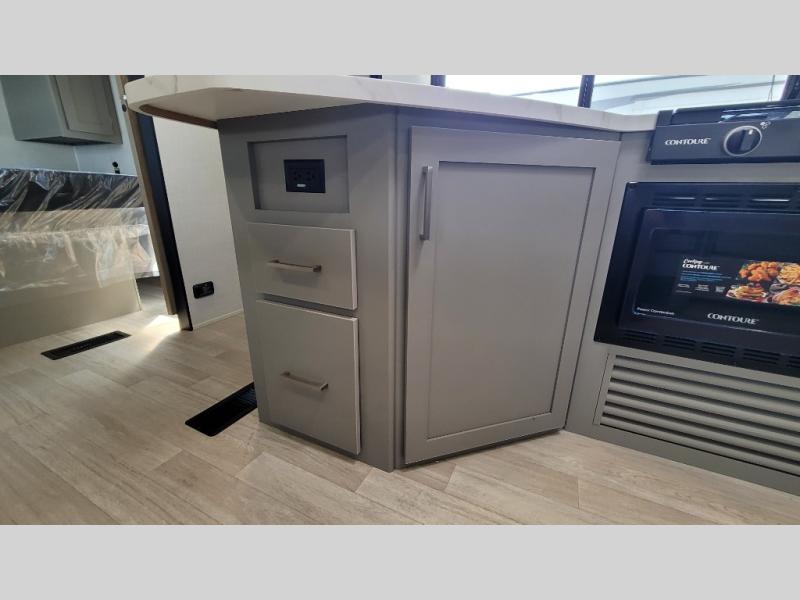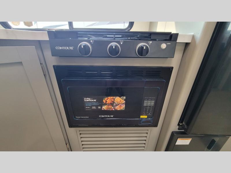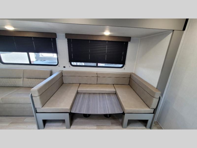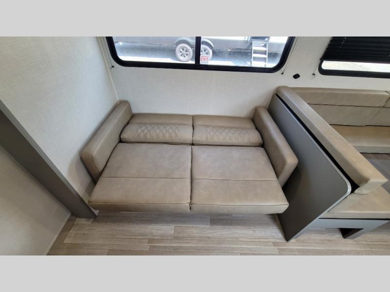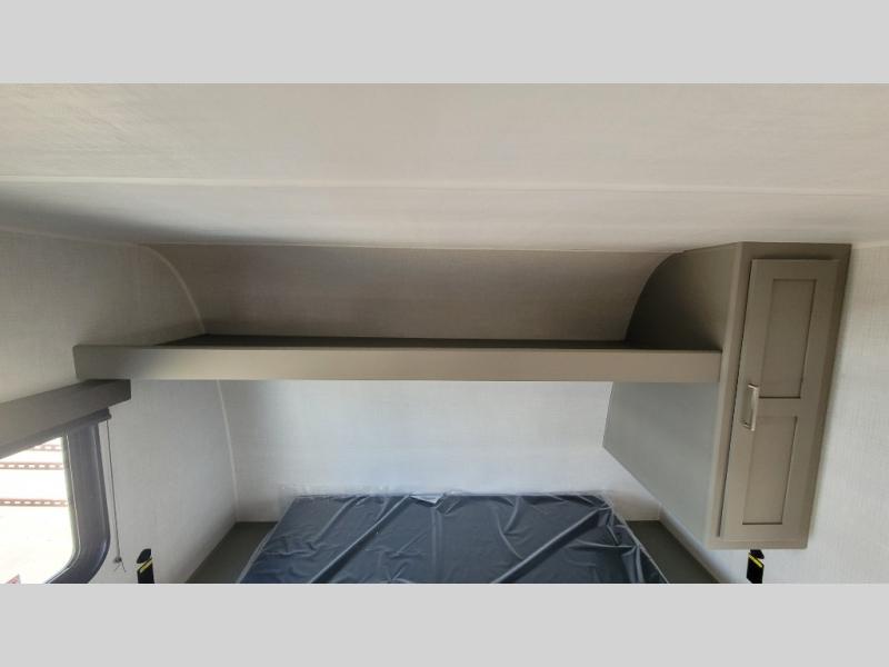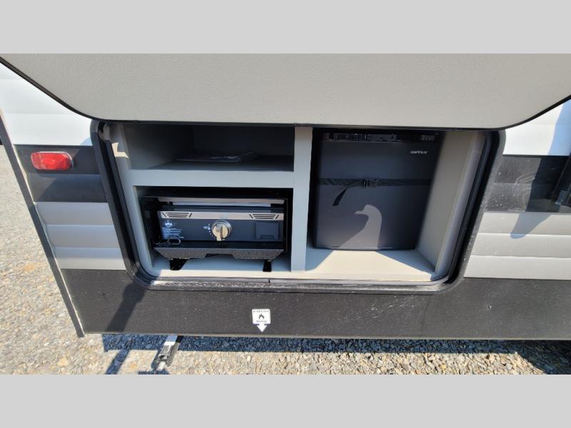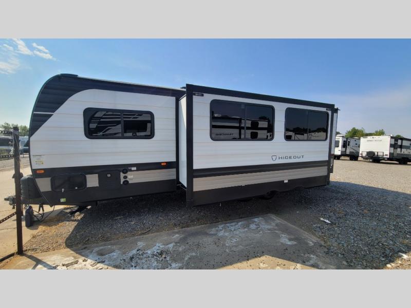 A large slide, front private bedroom, and double-size bunks make this Hideout Sport Double Axle the ultimate travel trailer! You will enjoy a walk-around queen bed in the bedroom plus dual closets and nightstands for your things. The full bath is towards the back and beside the bunks for easy nighttime use, and there is a pass-through storage outside for your gear. Head to the kitchen to prepare lunch on the cooktop, then dine at the U-shaped dinette and sofa within the large slide. If the weather is nice, you might just want to cook outdoors on the outside kitchen under the 18' power awning!
