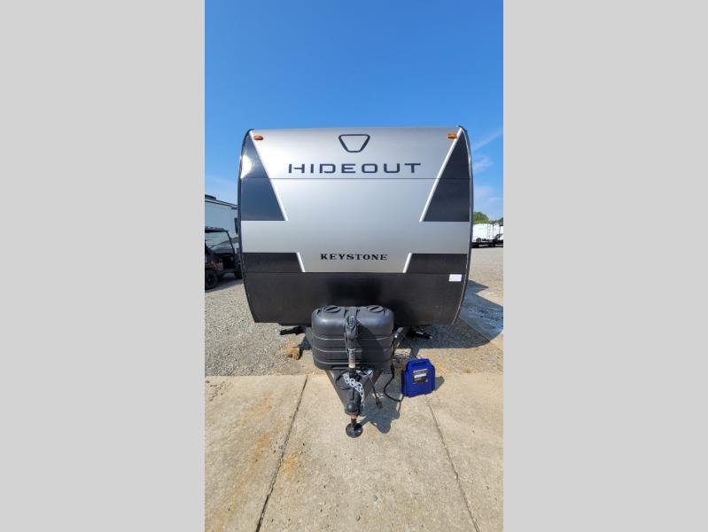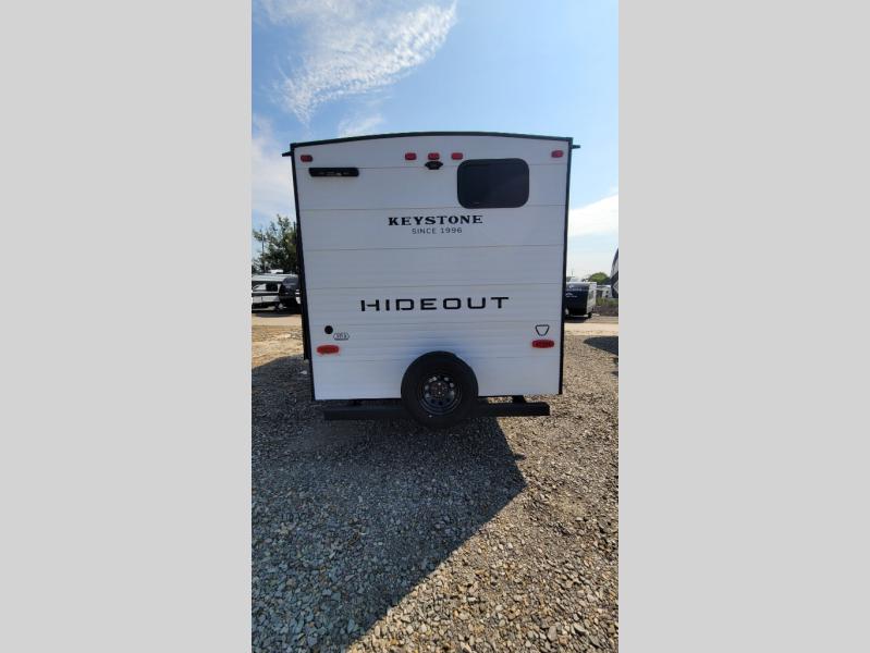 With any Hideout Sport travel trailer by Keystone you will enjoy simplified camping solutions that won't break the bank! Each model is constructed with a durable AlphaPly TPO roof membrane tinted safety glass windows, and an I-beam frame. There are power tongue jacks and heavy duty stabilizer jacks that will make it easier than ever to hitch up and go. An XL entry assist handle will also provide convenience, along with a power awning that will provide much wanted shade during the day. You will feel right at home with stylish decor, blackout night shades, and cozy bed with storage underneath!