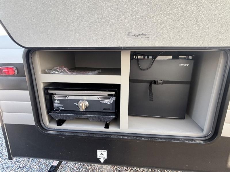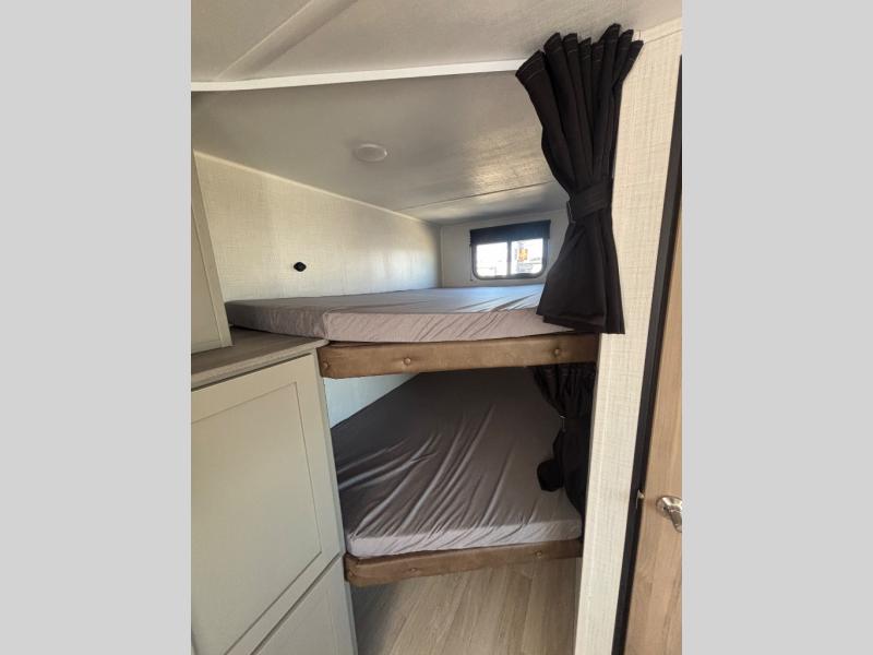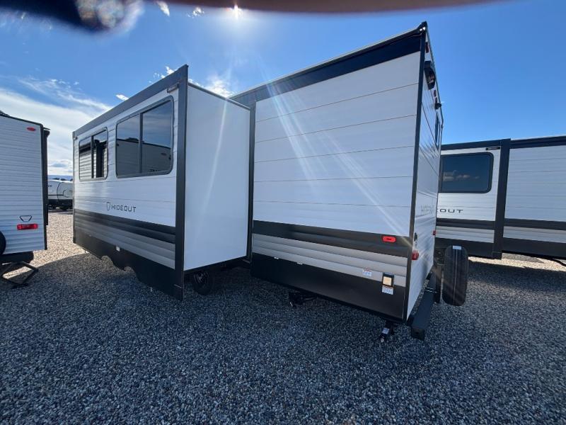A large slide, front private bedroom, and double-size bunks make this Hideout Sport Double Axle the ultimate travel trailer! You will enjoy a walk-around queen bed in the bedroom plus dual closets and nightstands for your things. The full bath is towards the back and beside the bunks for easy nighttime use, and there is a pass-through storage outside for your gear. Head to the kitchen to prepare lunch on the cooktop, then dine at the U-shaped dinette and sofa within the large slide. If the weather is nice, you might just want to cook outdoors on the outside kitchen under the 18' power awning!