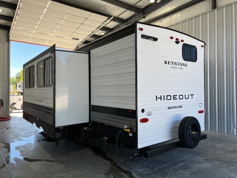 With any Hideout Sport travel trailer by Keystone you will enjoy simplified camping solutions that won't break the bank! Each model is constructed with a durable AlphaPly TPO roof membrane tinted safety glass windows, and an I-beam frame. There are power tongue jacks and heavy duty stabilizer jacks that will make it easier than ever to hitch up and go. An XL entry assist handle will also provide convenience, along with a power awning that will provide much wanted shade during the day. You will feel right at home with stylish decor, blackout night shades, and cozy bed with storage underneath!