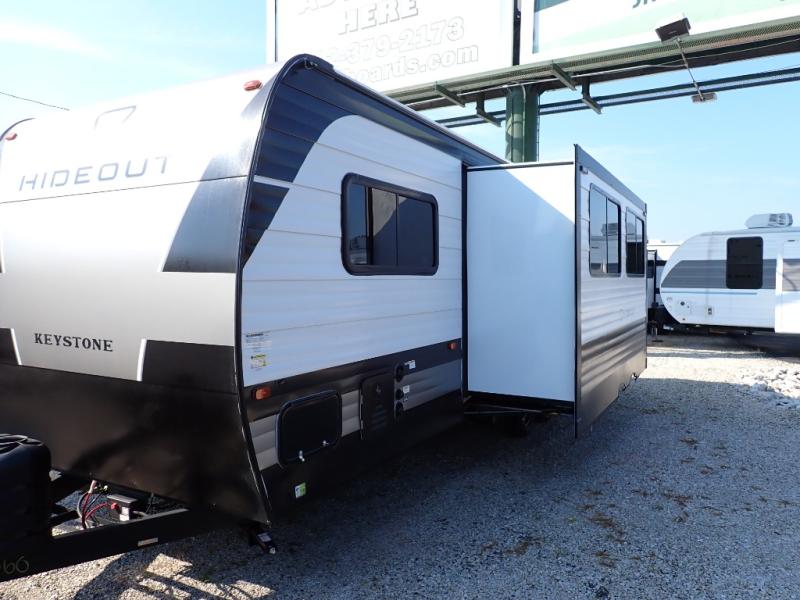 A large slide, front private bedroom, and double-size bunks make this Hideout Sport Double Axle the ultimate travel trailer! You will enjoy a walk-around queen bed in the bedroom plus dual closets and nightstands for your things. The full bath is towards the back and beside the bunks for easy nighttime use, and there is a pass-through storage outside for your gear. Head to the kitchen to prepare lunch on the cooktop, then dine at the U-shaped dinette and sofa within the large slide. If the weather is nice, you might just want to cook outdoors on the outside kitchen under the 18' power awning!