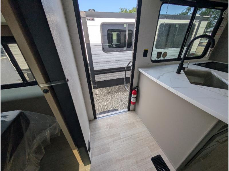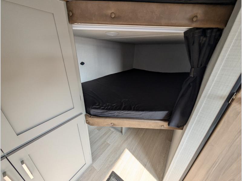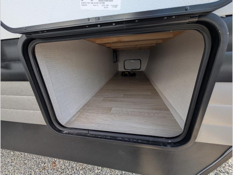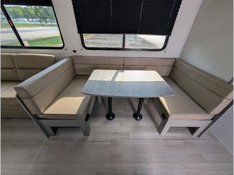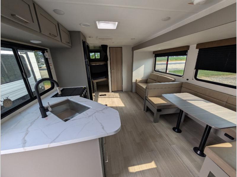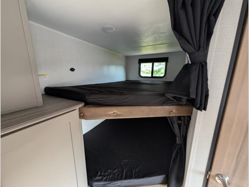 A large slide, front private bedroom, and double-size bunks make this Hideout Sport Double Axle the ultimate travel trailer! You will enjoy a walk-around queen bed in the bedroom plus dual closets and nightstands for your things. The full bath is towards the back and beside the bunks for easy nighttime use, and there is a pass-through storage outside for your gear. Head to the kitchen to prepare lunch on the cooktop, then dine at the U-shaped dinette and sofa within the large slide. If the weather is nice, you might just want to cook outdoors on the outside kitchen under the 18' power awning!