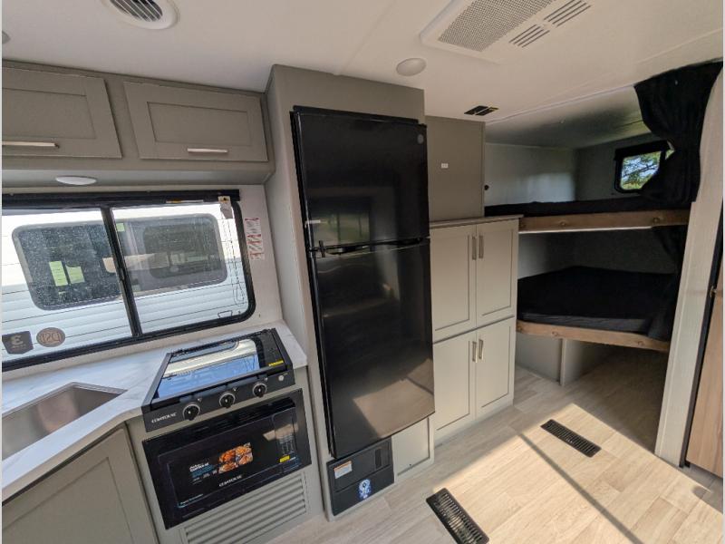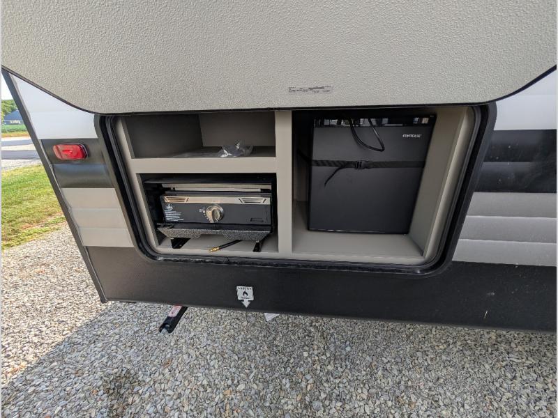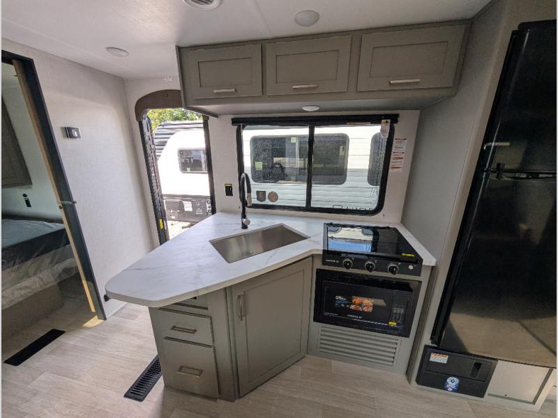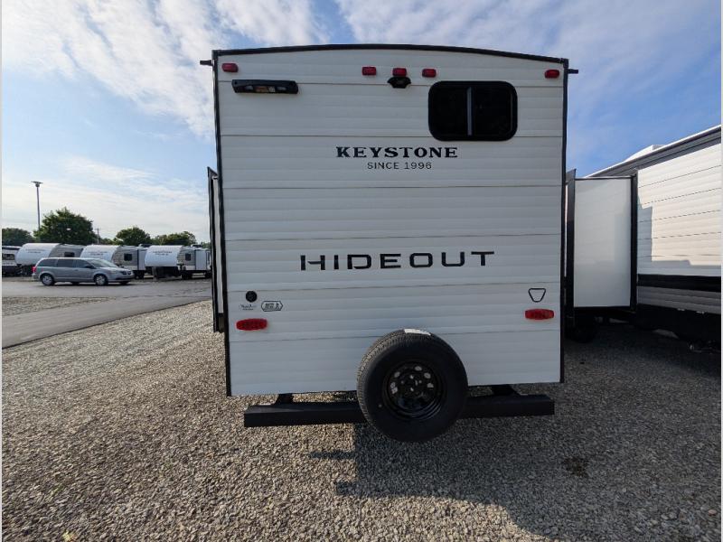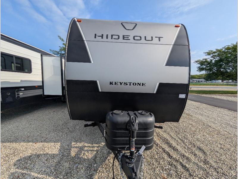 With any Hideout Sport travel trailer by Keystone you will enjoy simplified camping solutions that won't break the bank! Each model is constructed with a durable AlphaPly TPO roof membrane tinted safety glass windows, and an I-beam frame. There are power tongue jacks and heavy duty stabilizer jacks that will make it easier than ever to hitch up and go. An XL entry assist handle will also provide convenience, along with a power awning that will provide much wanted shade during the day. You will feel right at home with stylish decor, blackout night shades, and cozy bed with storage underneath!