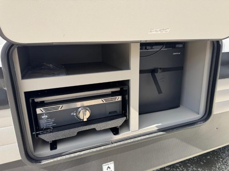 A large slide, front private bedroom, and double-size bunks make this Hideout Sport Double Axle the ultimate travel trailer! You will enjoy a walk-around queen bed in the bedroom plus dual closets and nightstands for your things. The full bath is towards the back and beside the bunks for easy nighttime use, and there is a pass-through storage outside for your gear. Head to the kitchen to prepare lunch on the cooktop, then dine at the U-shaped dinette and sofa within the large slide. If the weather is nice, you might just want to cook outdoors on the outside kitchen under the 18' power awning!