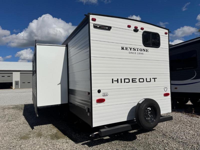 With any Hideout Sport travel trailer by Keystone you will enjoy simplified camping solutions that won't break the bank! Each model is constructed with a durable AlphaPly TPO roof membrane tinted safety glass windows, and an I-beam frame. There are power tongue jacks and heavy duty stabilizer jacks that will make it easier than ever to hitch up and go. An XL entry assist handle will also provide convenience, along with a power awning that will provide much wanted shade during the day. You will feel right at home with stylish decor, blackout night shades, and cozy bed with storage underneath!