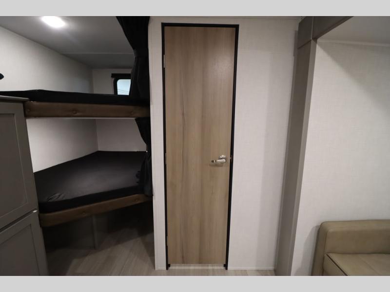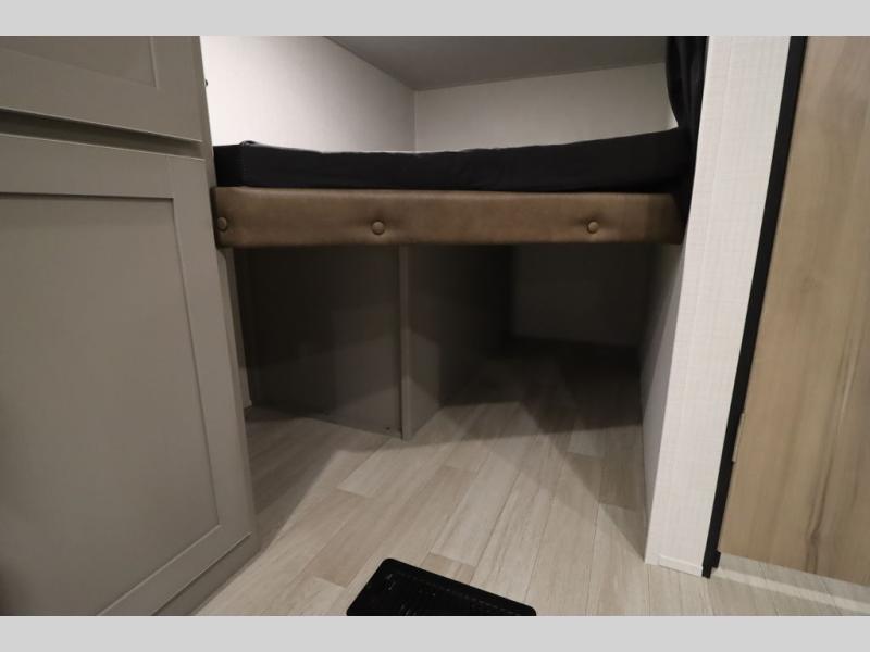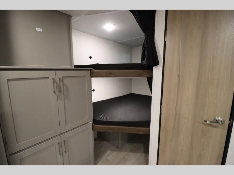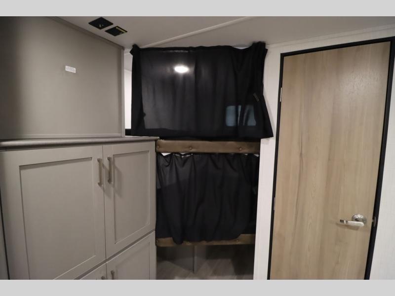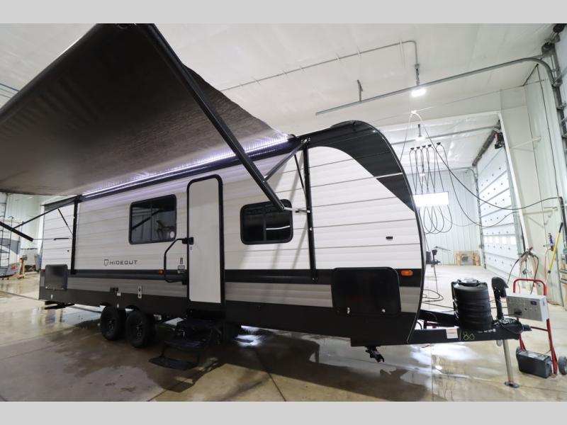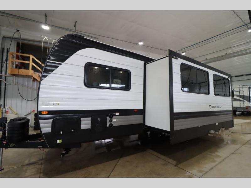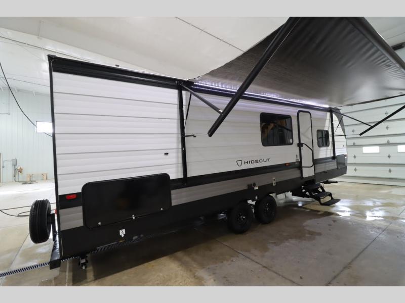 A large slide, front private bedroom, and double-size bunks make this Hideout Sport Double Axle the ultimate travel trailer! You will enjoy a walk-around queen bed in the bedroom plus dual closets and nightstands for your things. The full bath is towards the back and beside the bunks for easy nighttime use, and there is a pass-through storage outside for your gear. Head to the kitchen to prepare lunch on the cooktop, then dine at the U-shaped dinette and sofa within the large slide. If the weather is nice, you might just want to cook outdoors on the outside kitchen under the 18' power awning!