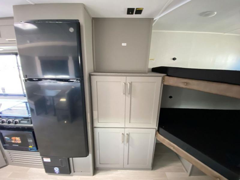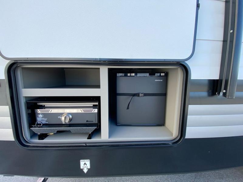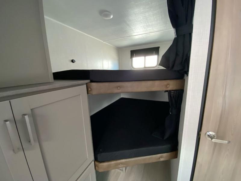 A large slide, front private bedroom, and double-size bunks make this Hideout Sport Double Axle the ultimate travel trailer! You will enjoy a walk-around queen bed in the bedroom plus dual closets and nightstands for your things. The full bath is towards the back and beside the bunks for easy nighttime use, and there is a pass-through storage outside for your gear. Head to the kitchen to prepare lunch on the cooktop, then dine at the U-shaped dinette and sofa within the large slide. If the weather is nice, you might just want to cook outdoors on the outside kitchen under the 18' power awning!