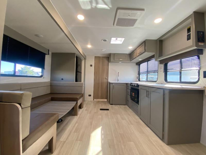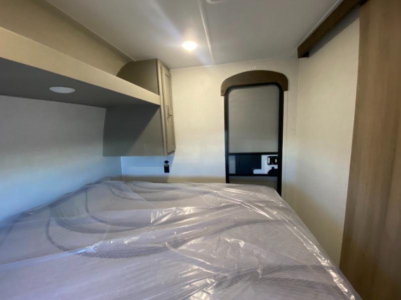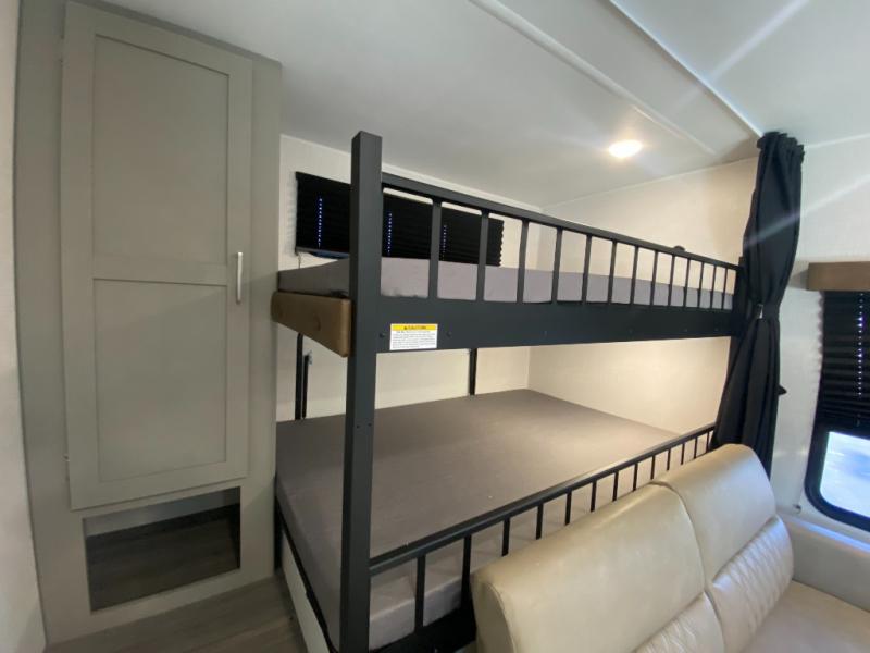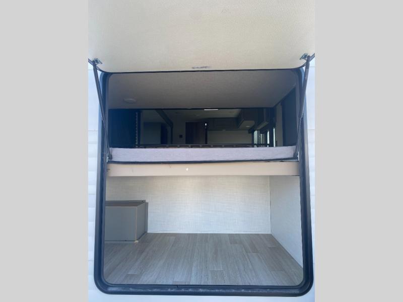 You can easily sleep nine to ten in this travel trailer, so invite the whole gang along! The bunks with flip-up utility storage will allow you to bring along extra gear, plus there is an exterior pass-thru and outside storage so nothing gets left behind. You'll find your own bedroom up front with a queen bed, a private exterior entry door and your own entrance into the walk-through bath! Once lunch has been made, your crew can dine around the U-shaped dinette, relax on the sofa, or enjoy some fresh air under the 18' power awning outdoors!