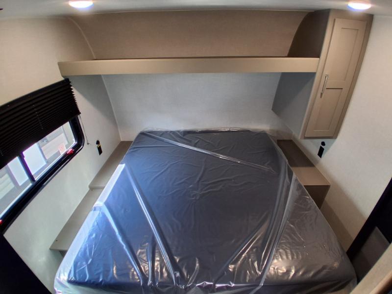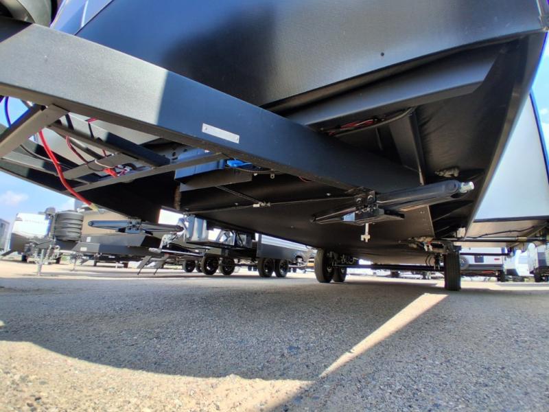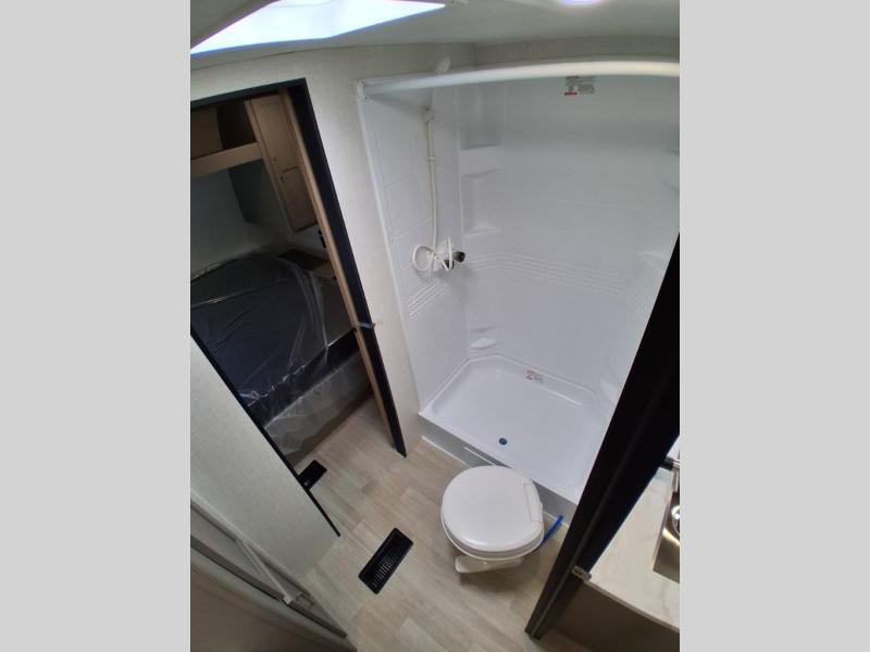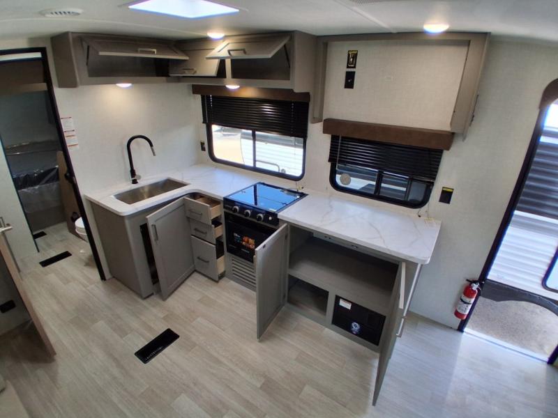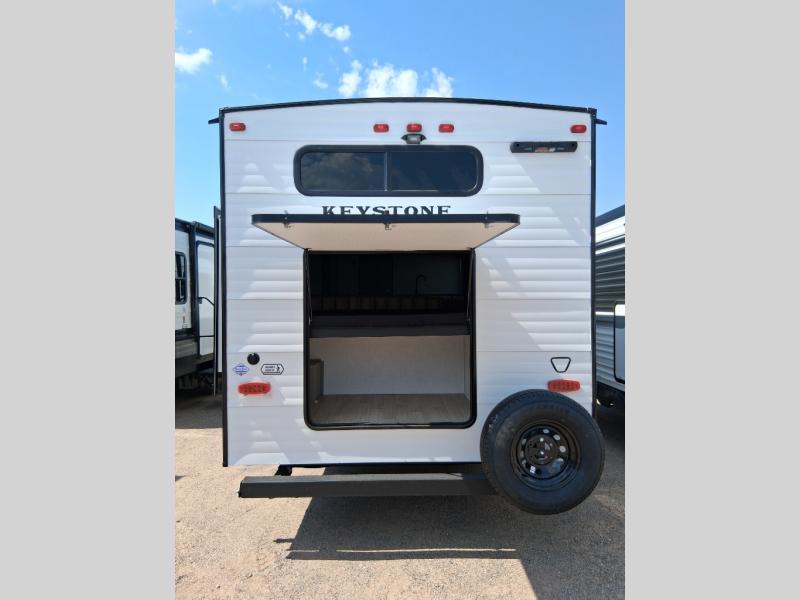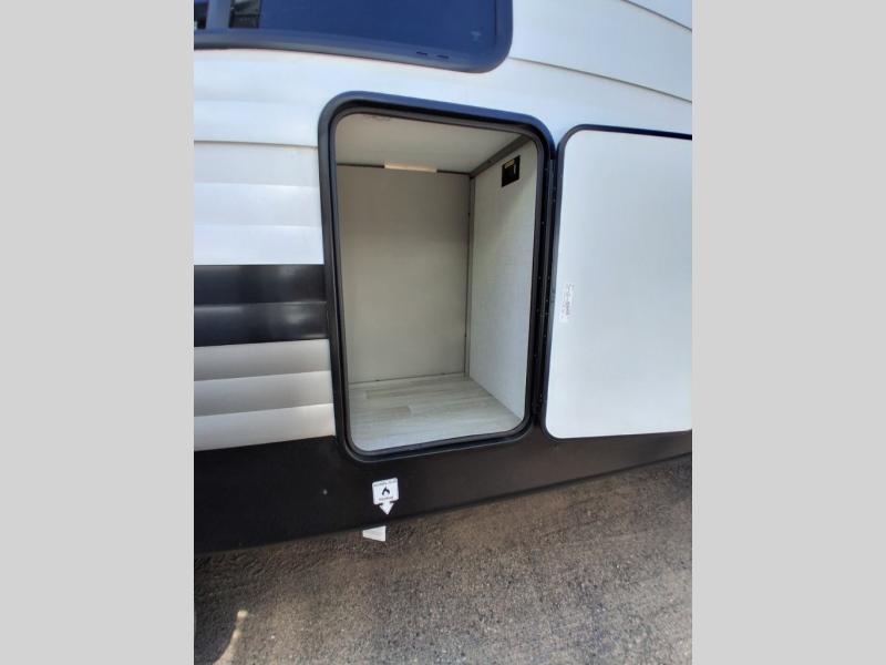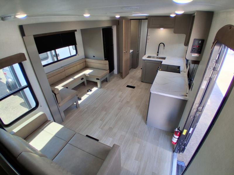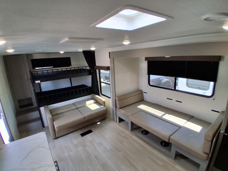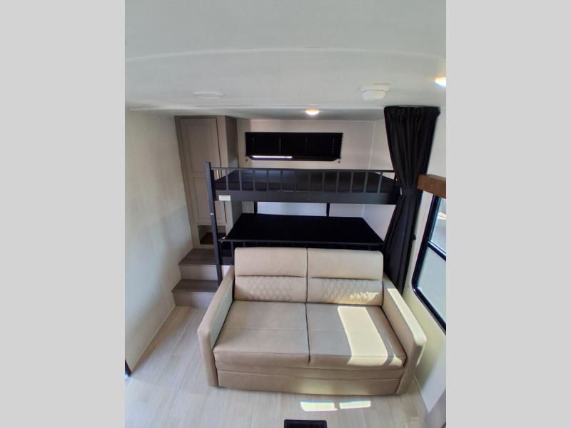 You can easily sleep nine to ten in this travel trailer, so invite the whole gang along! The bunks with flip-up utility storage will allow you to bring along extra gear, plus there is an exterior pass-thru and outside storage so nothing gets left behind. You'll find your own bedroom up front with a queen bed, a private exterior entry door and your own entrance into the walk-through bath! Once lunch has been made, your crew can dine around the U-shaped dinette, relax on the sofa, or enjoy some fresh air under the 18' power awning outdoors!