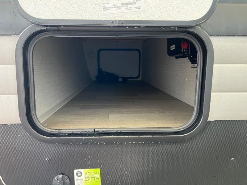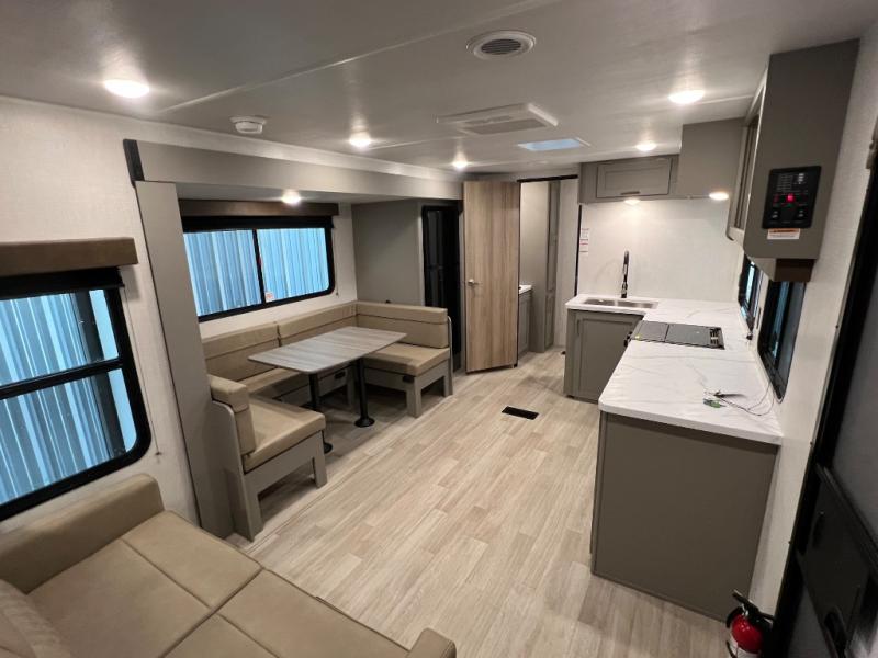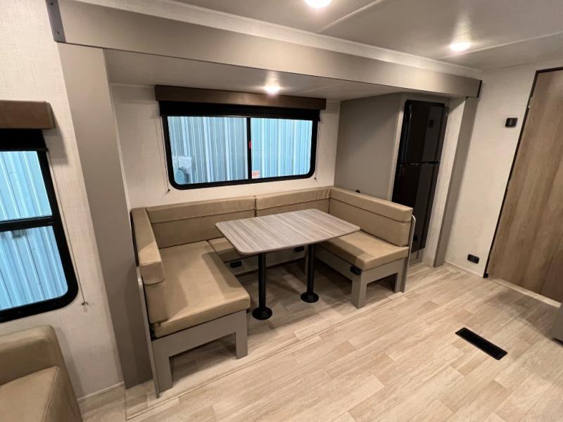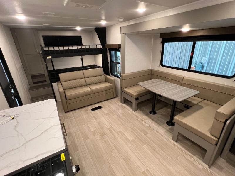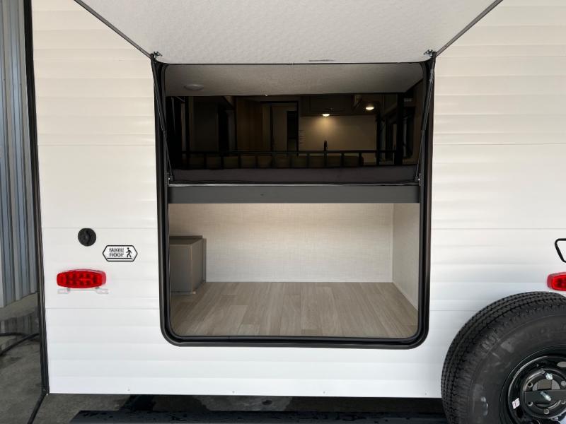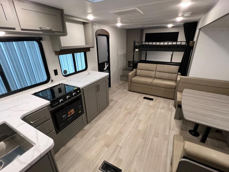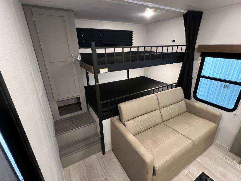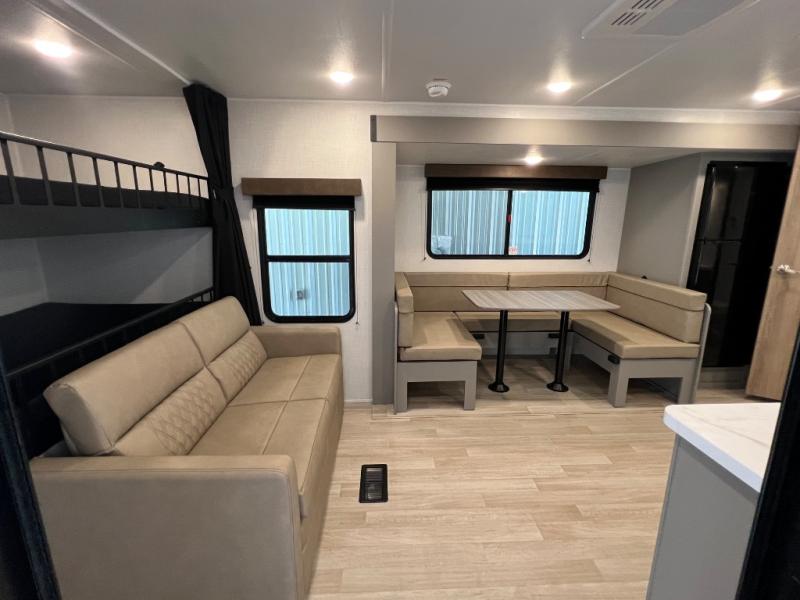 You can easily sleep nine to ten in this travel trailer, so invite the whole gang along! The bunks with flip-up utility storage will allow you to bring along extra gear, plus there is an exterior pass-thru and outside storage so nothing gets left behind. You'll find your own bedroom up front with a queen bed, a private exterior entry door and your own entrance into the walk-through bath! Once lunch has been made, your crew can dine around the U-shaped dinette, relax on the sofa, or enjoy some fresh air under the 18' power awning outdoors!