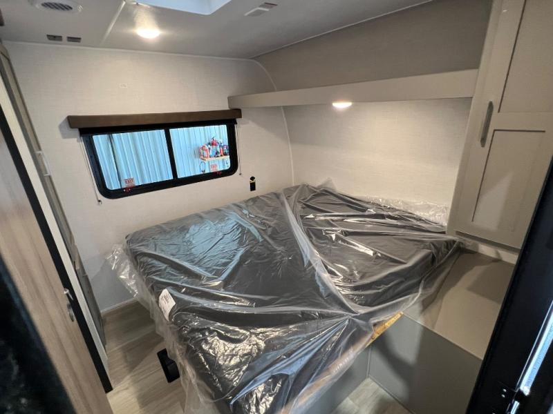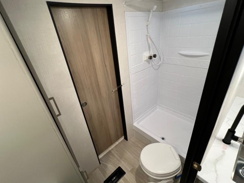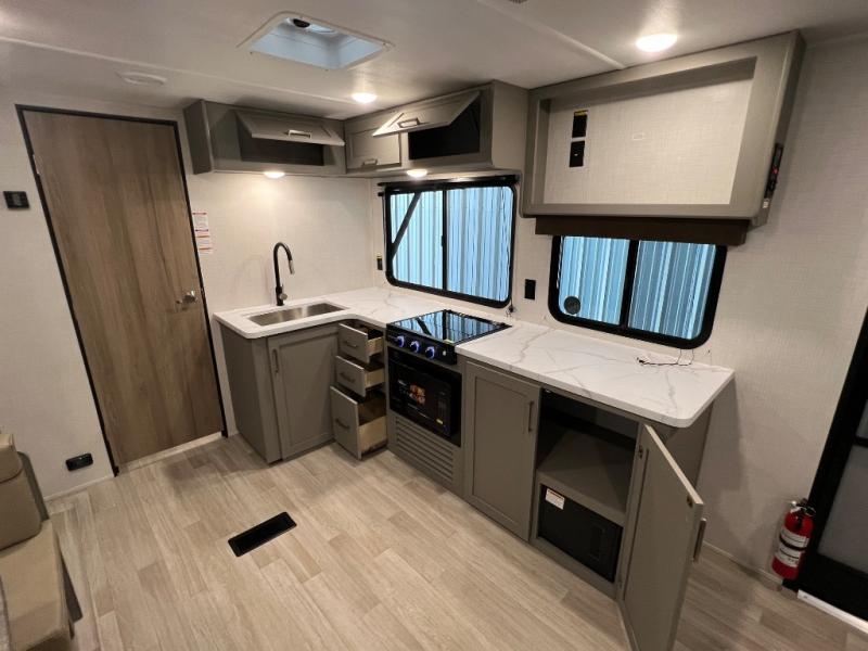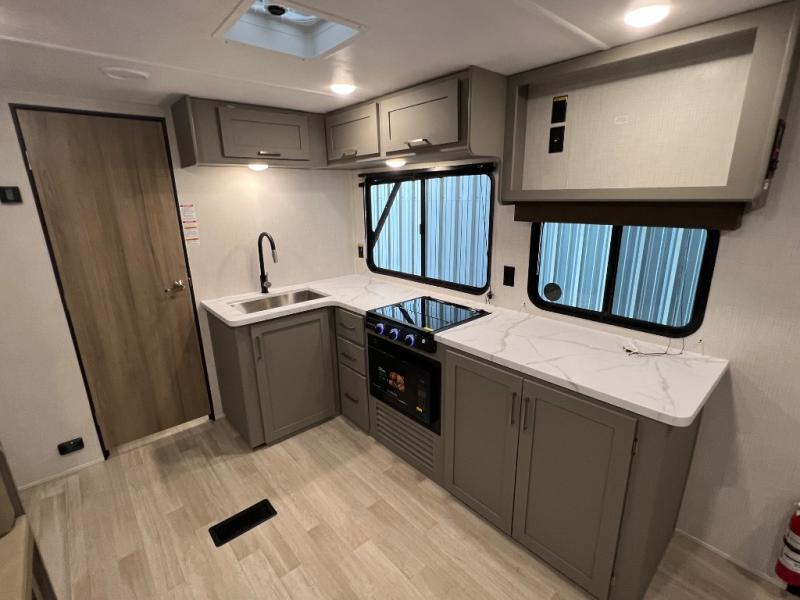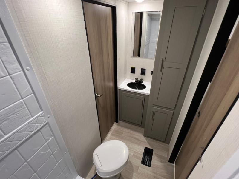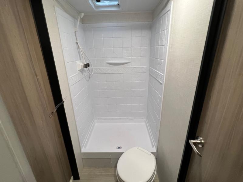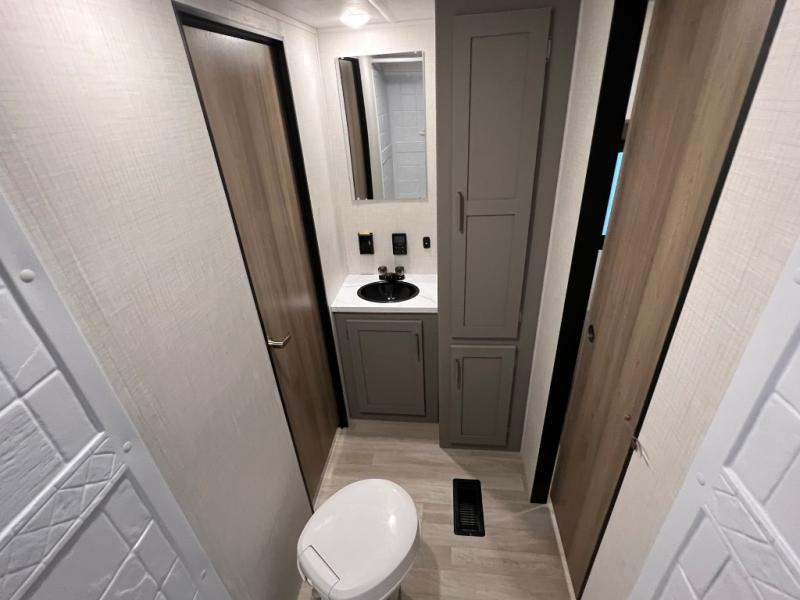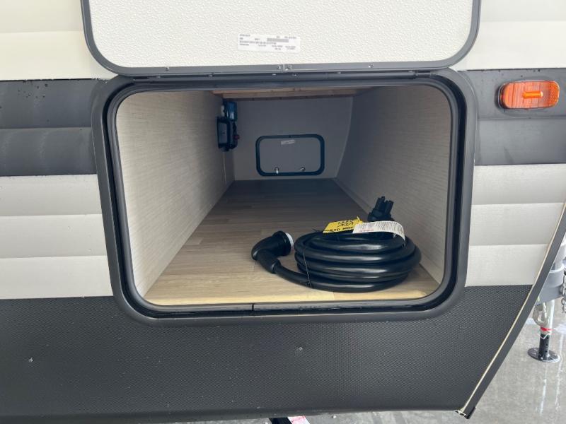 You can easily sleep nine to ten in this travel trailer, so invite the whole gang along! The bunks with flip-up utility storage will allow you to bring along extra gear, plus there is an exterior pass-thru and outside storage so nothing gets left behind. You'll find your own bedroom up front with a queen bed, a private exterior entry door and your own entrance into the walk-through bath! Once lunch has been made, your crew can dine around the U-shaped dinette, relax on the sofa, or enjoy some fresh air under the 18' power awning outdoors!
