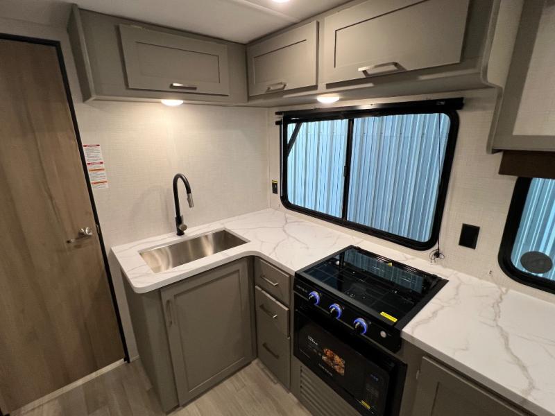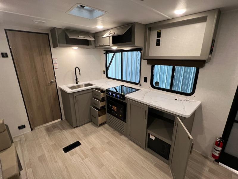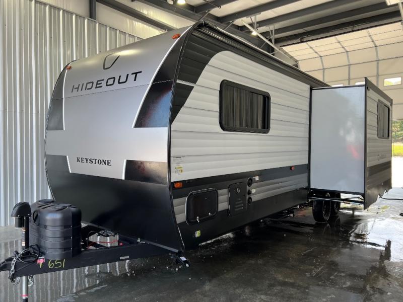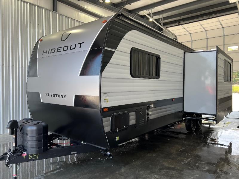 With any Hideout Sport travel trailer by Keystone you will enjoy simplified camping solutions that won't break the bank! Each model is constructed with a durable AlphaPly TPO roof membrane tinted safety glass windows, a walkable roof, and an I-beam frame. There are power tongue jacks and heavy duty stabilizer jacks that will make it easier than ever to hitch up and go. An XL entry assist handle will also provide convenience, along with a power awning that will provide much wanted shade during the day. You will feel right at home with stylish decor, blackout night shades, and cozy bed with storage underneath!