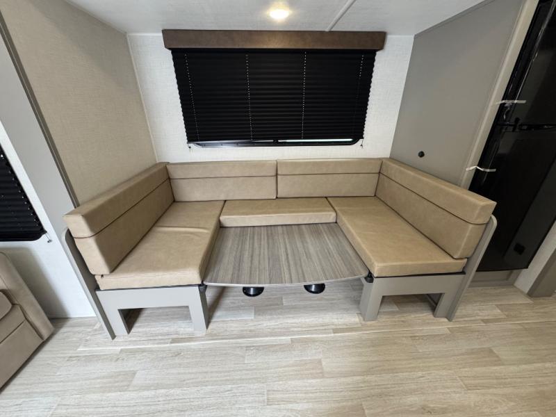 You can easily sleep nine to ten in this travel trailer, so invite the whole gang along! The bunks with flip-up utility storage will allow you to bring along extra gear, plus there is an exterior pass-thru and outside storage so nothing gets left behind. You'll find your own bedroom up front with a queen bed, a private exterior entry door and your own entrance into the walk-through bath! Once lunch has been made, your crew can dine around the U-shaped dinette, relax on the sofa, or enjoy some fresh air under the 18' power awning outdoors!