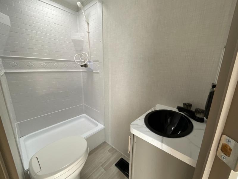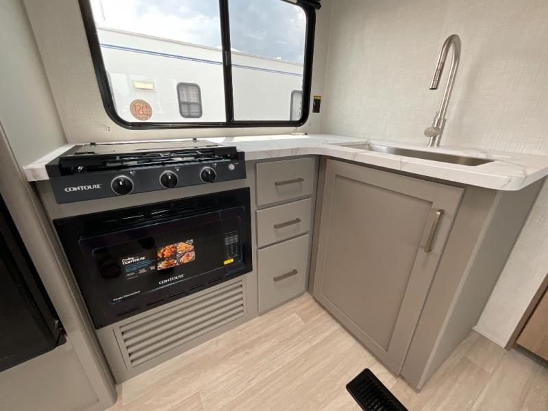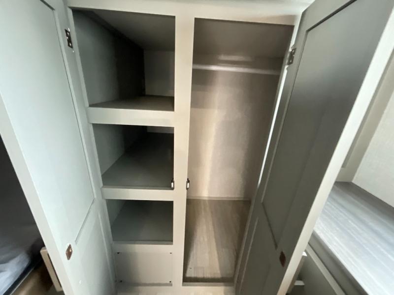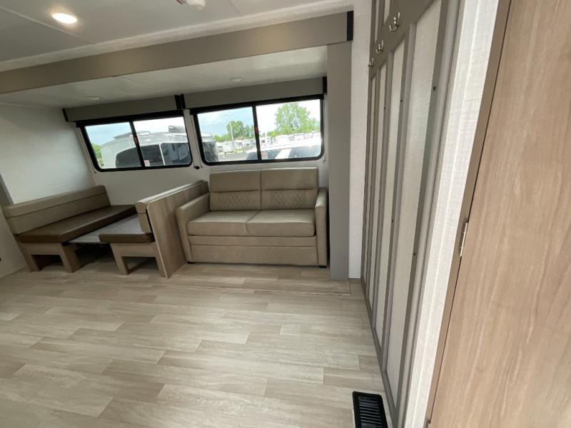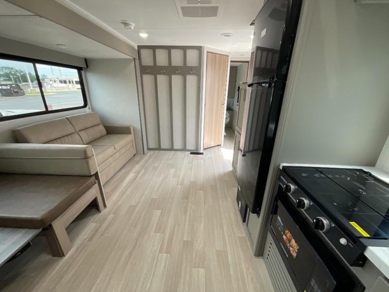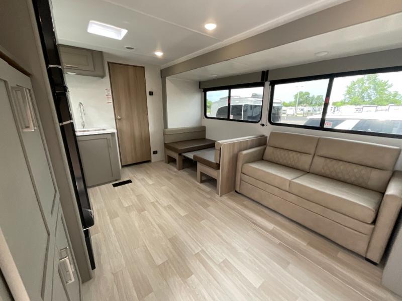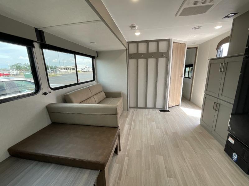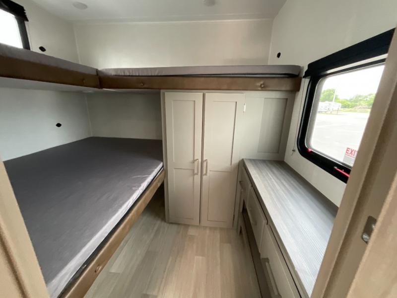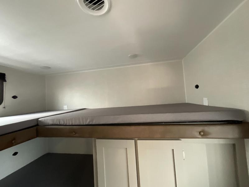 Inside the Hideout 291BR, space and functionality come together seamlessly. The rear bedroom features a cozy queen bed and ample wardrobe storage, providing a private retreat for parents or couples. The front bunkhouse offers double-over-double bunks, making it ideal for kids, guests, or extra storage when not in use. The convertible dinette adds versatility, serving as additional seating or sleeping space as needed. The kitchen is fully equipped with modern appliances, plenty of counter space, and abundant cabinetry, making meal prep and storage easy. A full bathroom with a roomy shower and practical storage keeps everyone comfortable and organized.
