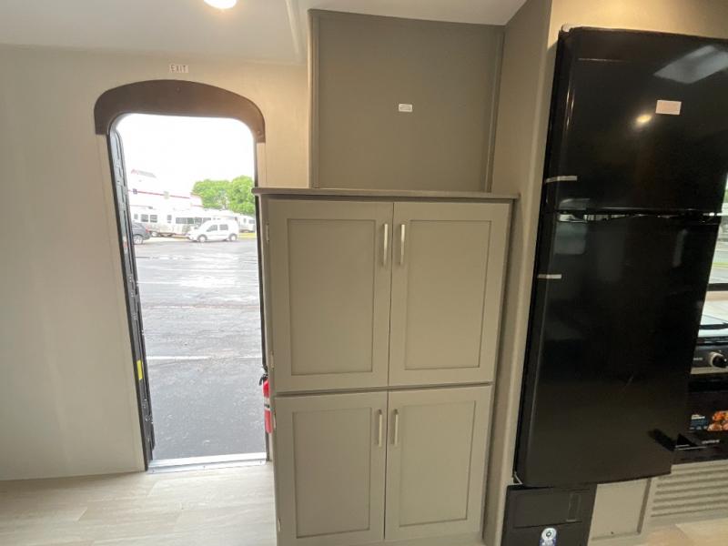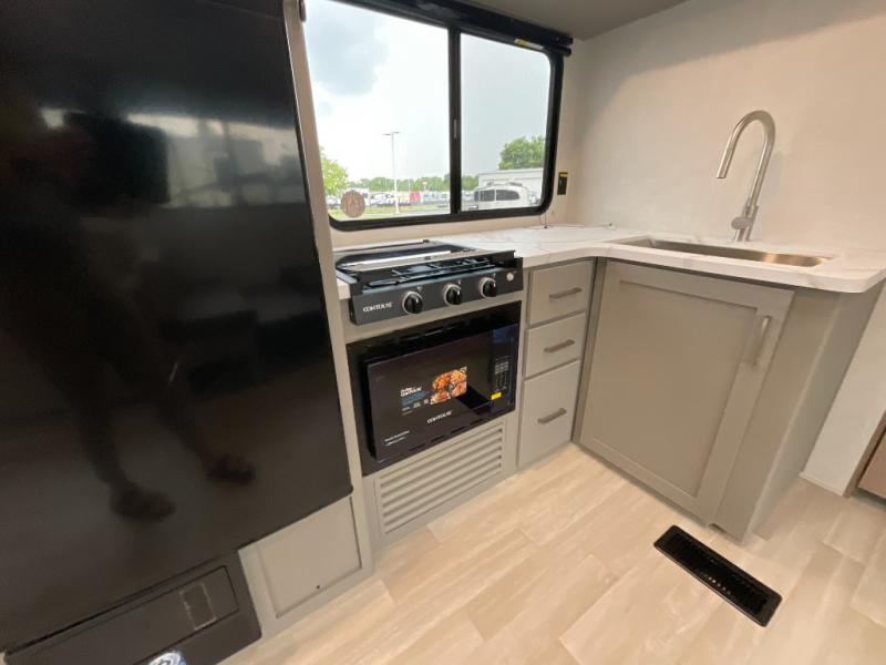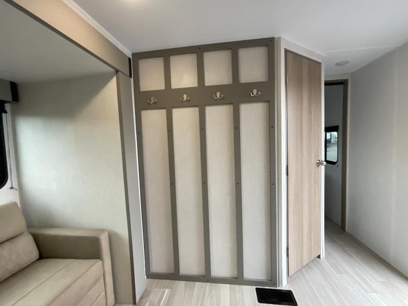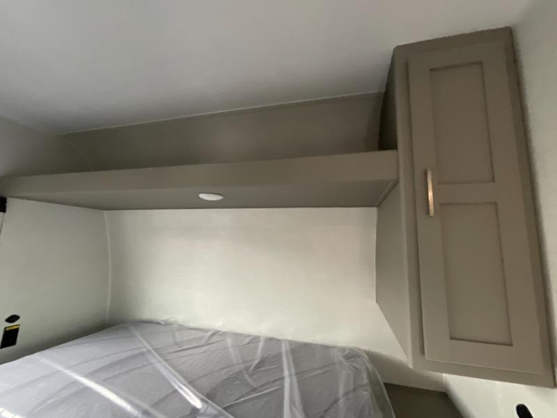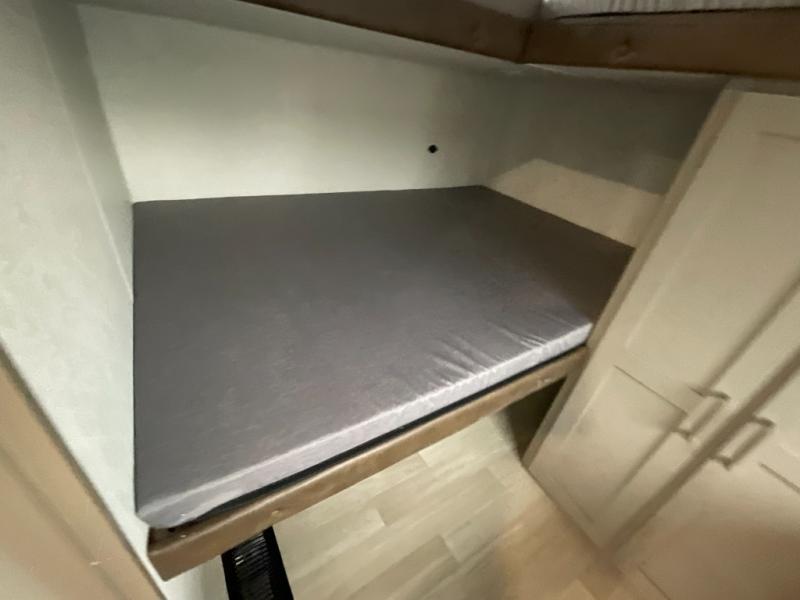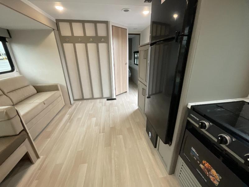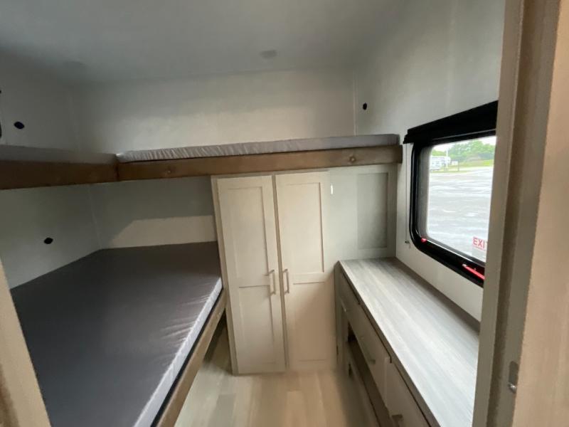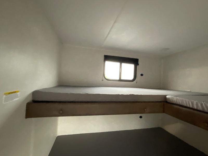 Inside the Hideout 291BR, space and functionality come together seamlessly. The rear bedroom features a cozy queen bed and ample wardrobe storage, providing a private retreat for parents or couples. The front bunkhouse offers double-over-double bunks, making it ideal for kids, guests, or extra storage when not in use. The convertible dinette adds versatility, serving as additional seating or sleeping space as needed. The kitchen is fully equipped with modern appliances, plenty of counter space, and abundant cabinetry, making meal prep and storage easy. A full bathroom with a roomy shower and practical storage keeps everyone comfortable and organized.