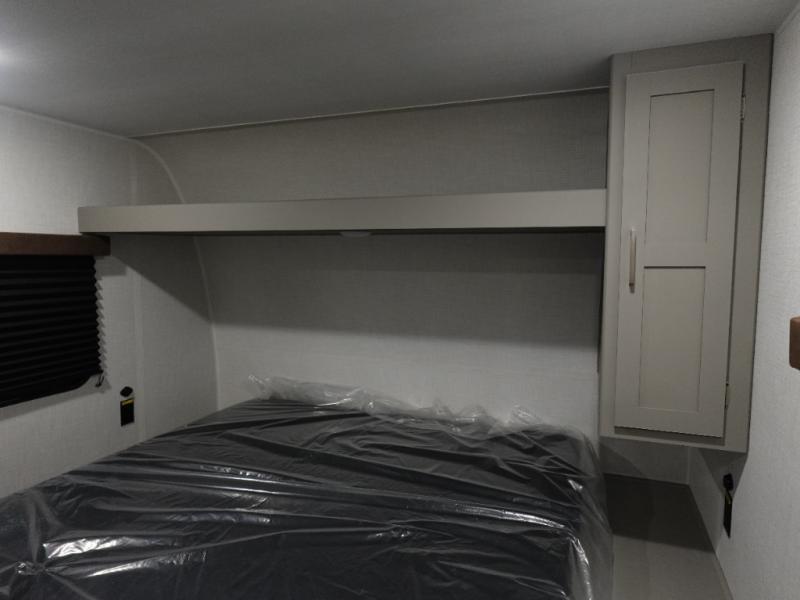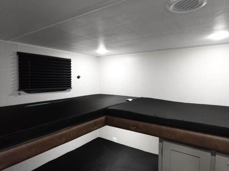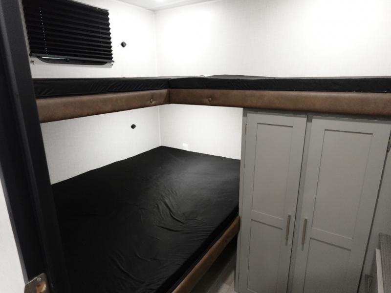 If you enjoy camping with extra friends and family, this travel trailer will be perfect for you! There is a rear bunkhouse with triple bunks, a dresser, plus a closet, making this room perfect for guests. Up front you'll find the private bedroom with a king bed, dual nightstands and dual closets for your things, and the full bath is close by for convenience. The chef of your group will have a cooktop to prepare meals, ample counter space, plus a pantry for dry goods and snacks. Your crew can play a game at the booth dinette or relax on the sofa while dinner is being made, or they can relax outdoors under the 16' power awning!