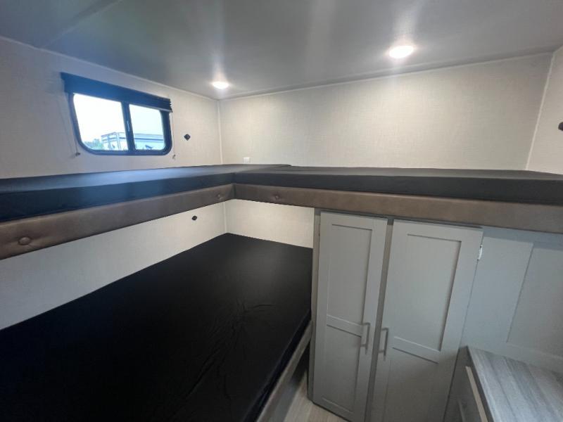 If you enjoy camping with extra friends and family, this travel trailer will be perfect for you! There is a rear bunkhouse with triple bunks, a dresser, plus a closet, making this room perfect for guests. Up front you'll find the private bedroom with a queen bed, dual nightstands and dual closets for your things, and the full bath is close by for convenience. The chef of your group will have a cooktop to prepare meals, ample counter space, plus a pantry for dry goods and snacks. Your crew can play a game at the booth dinette or relax on the sofa while dinner is being made, or they can relax outdoors under the 16' power awning!