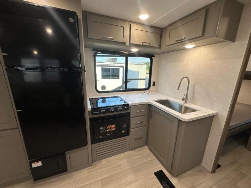 If you enjoy camping with extra friends and family, this travel trailer will be perfect for you! There is a rear bunkhouse with triple bunks, a dresser, plus a closet, making this room perfect for guests. Up front you'll find the private bedroom with a queen bed, dual nightstands and dual closets for your things, and the full bath is close by for convenience. The chef of your group will have a cooktop to prepare meals, ample counter space, plus a pantry for dry goods and snacks. Your crew can play a game at the booth dinette or relax on the sofa while dinner is being made, or they can relax outdoors under the 16' power awning!