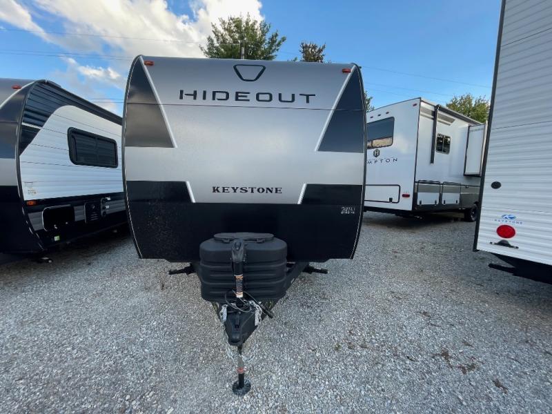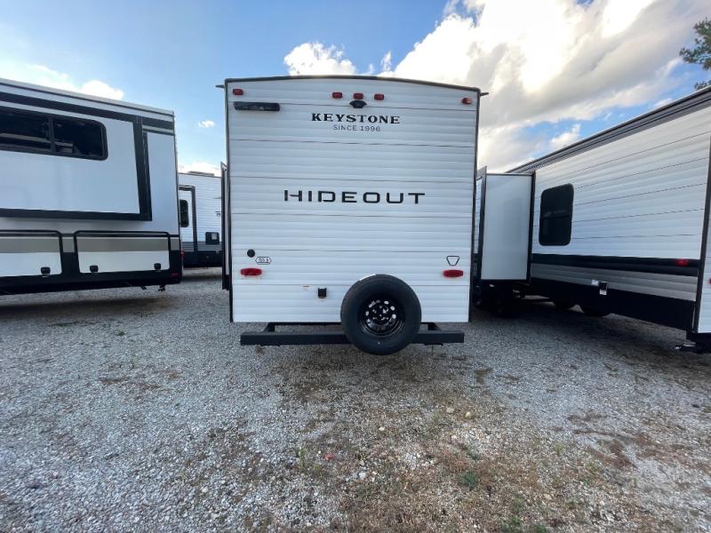 With any Hideout Sport travel trailer by Keystone you will enjoy simplified camping solutions that won't break the bank! Each model is constructed with a durable AlphaPly TPO roof membrane tinted safety glass windows, a walkable roof, and an I-beam frame. There are power tongue jacks and heavy duty stabilizer jacks that will make it easier than ever to hitch up and go. An XL entry assist handle will also provide convenience, along with a power awning that will provide much wanted shade during the day. You will feel right at home with stylish decor, blackout night shades, and cozy bed with storage underneath!