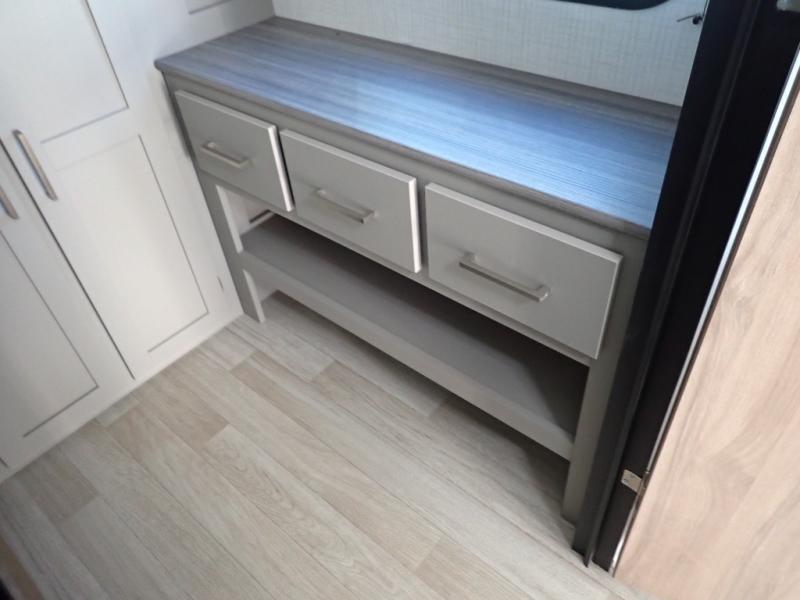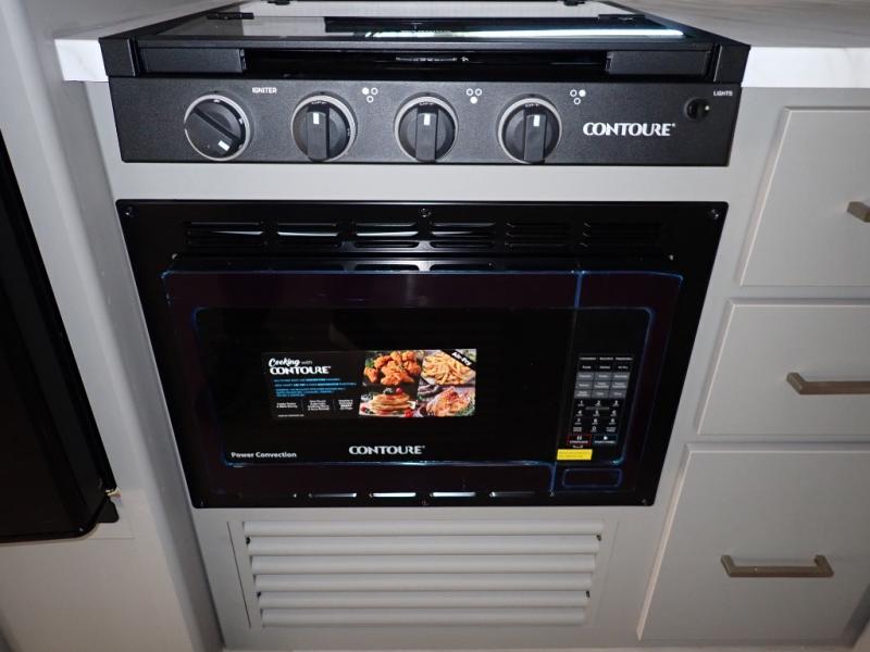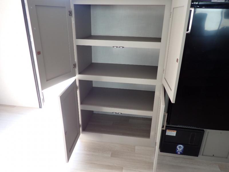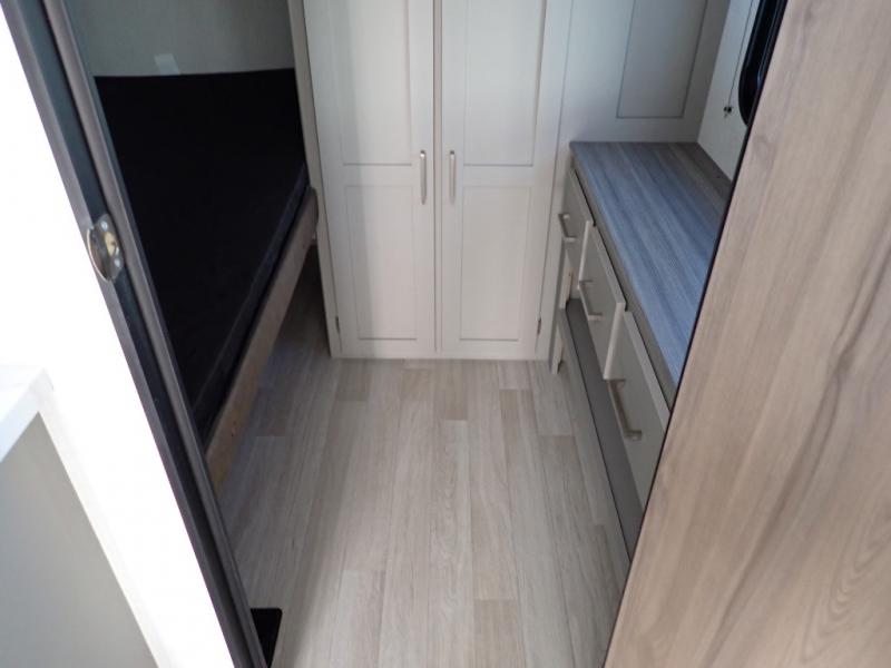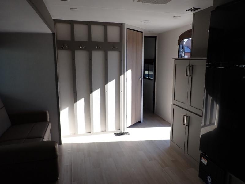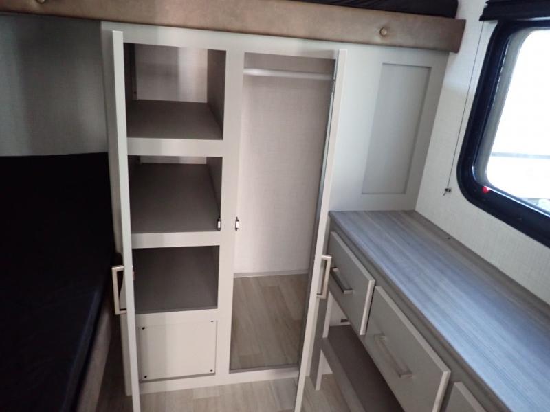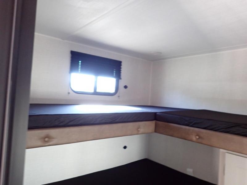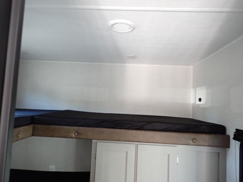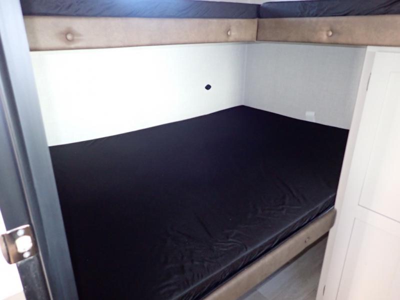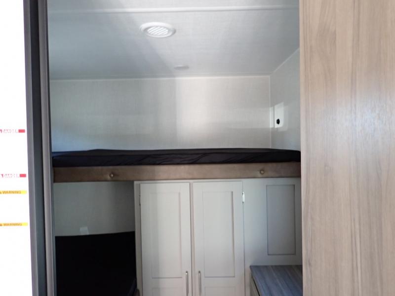If you enjoy camping with extra friends and family, this travel trailer will be perfect for you! There is a rear bunkhouse with triple bunks, a dresser, plus a closet, making this room perfect for guests. Up front you'll find the private bedroom with a queen bed, dual nightstands and dual closets for your things, and the full bath is close by for convenience. The chef of your group will have a cooktop to prepare meals, ample counter space, plus a pantry for dry goods and snacks. Your crew can play a game at the booth dinette or relax on the sofa while dinner is being made, or they can relax outdoors under the 16' power awning!