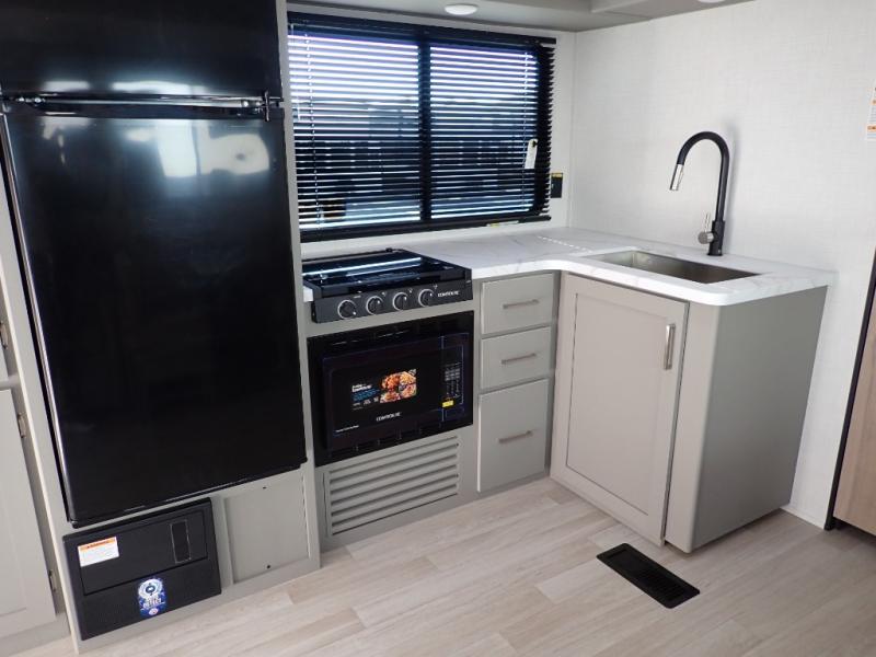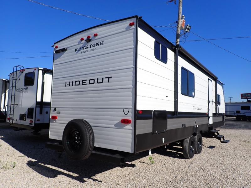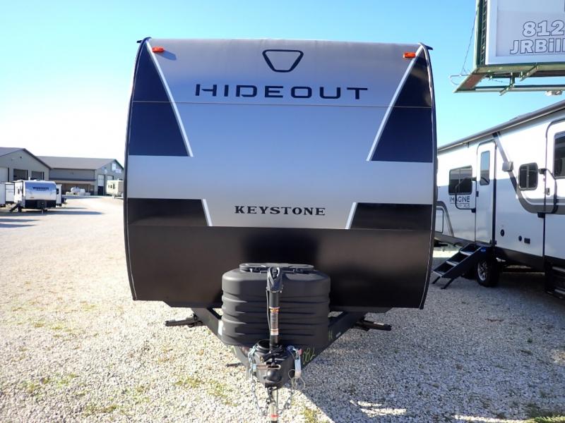 With any Hideout Sport travel trailer by Keystone you will enjoy simplified camping solutions that won't break the bank! Each model is constructed with a durable AlphaPly TPO roof membrane tinted safety glass windows, a walkable roof, and an I-beam frame. There are power tongue jacks and heavy duty stabilizer jacks that will make it easier than ever to hitch up and go. An XL entry assist handle will also provide convenience, along with a power awning that will provide much wanted shade during the day. You will feel right at home with stylish decor, blackout night shades, and cozy bed with storage underneath!