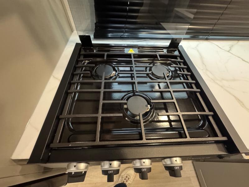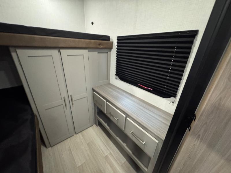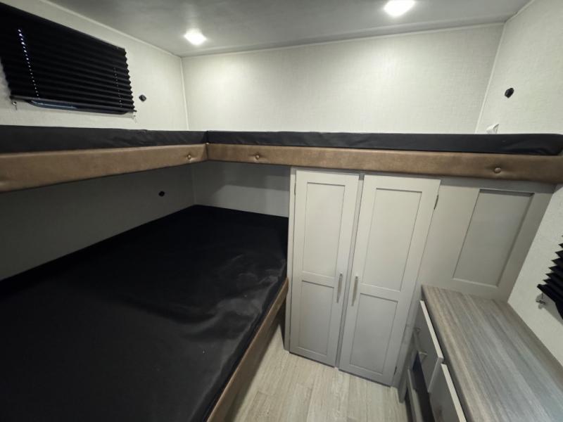 If you enjoy camping with extra friends and family, this travel trailer will be perfect for you! There is a rear bunkhouse with triple bunks, a dresser, plus a closet, making this room perfect for guests. Up front you'll find the private bedroom with a queen bed, dual nightstands and dual closets for your things, and the full bath is close by for convenience. The chef of your group will have a cooktop to prepare meals, ample counter space, plus a pantry for dry goods and snacks. Your crew can play a game at the booth dinette or relax on the sofa while dinner is being made, or they can relax outdoors under the 16' power awning!