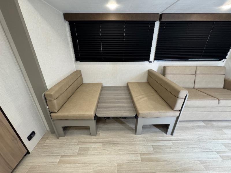 If you enjoy camping with extra friends and family, this travel trailer will be perfect for you! There is a rear bunkhouse with triple bunks, a dresser, plus a closet, making this room perfect for guests. Up front you'll find the private bedroom with a queen bed, dual nightstands and dual closets for your things, and the full bath is close by for convenience. The chef of your group will have a cooktop to prepare meals, ample counter space, plus a pantry for dry goods and snacks. Your crew can play a game at the booth dinette or relax on the sofa while dinner is being made, or they can relax outdoors under the 16' power awning!
