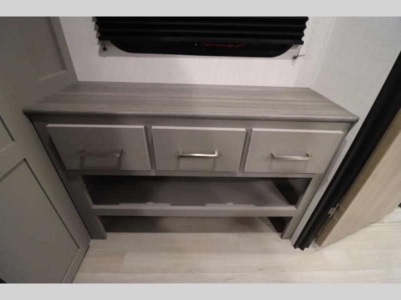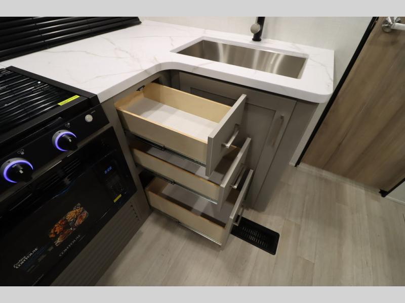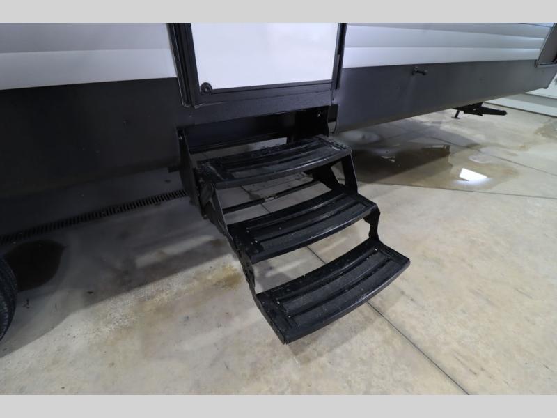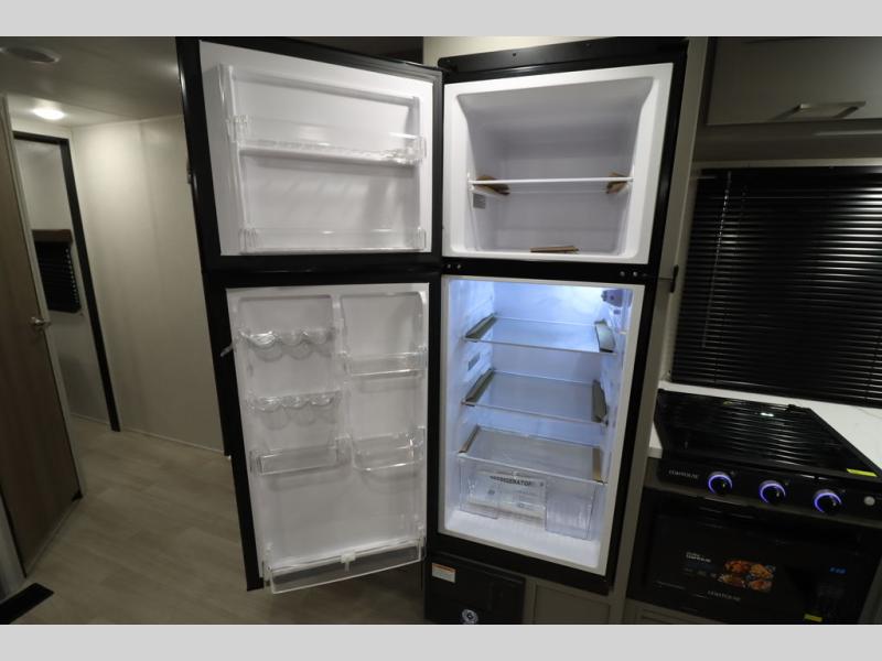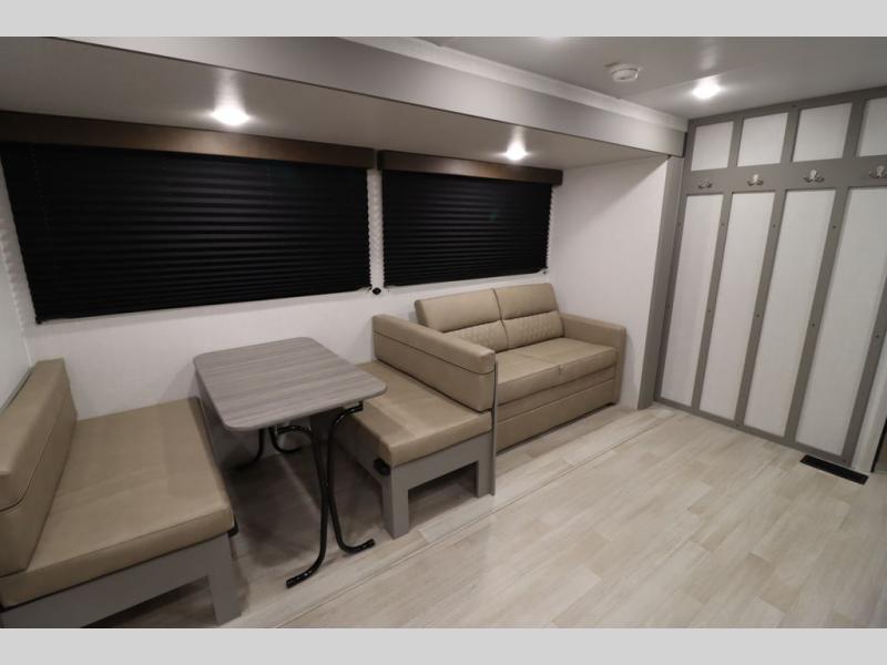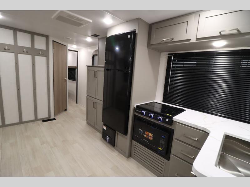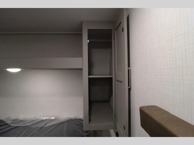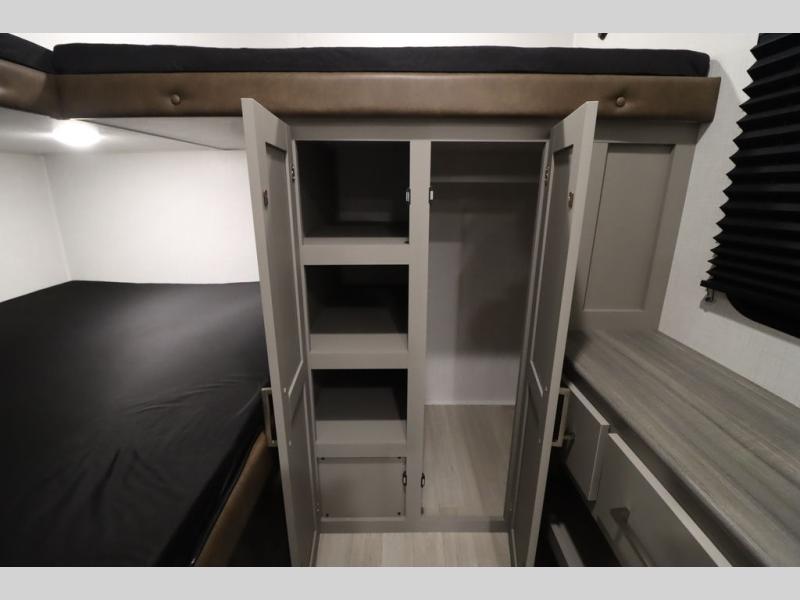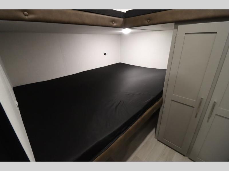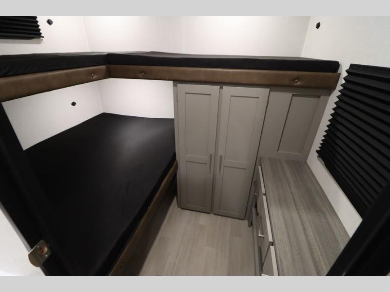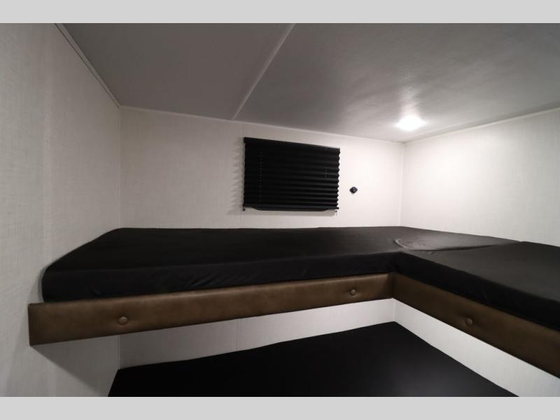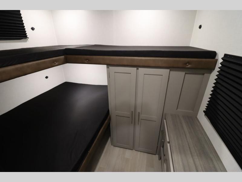If you enjoy camping with extra friends and family, this travel trailer will be perfect for you! There is a rear bunkhouse with triple bunks, a dresser, plus a closet, making this room perfect for guests. Up front you'll find the private bedroom with a queen bed, dual nightstands and dual closets for your things, and the full bath is close by for convenience. The chef of your group will have a cooktop to prepare meals, ample counter space, plus a pantry for dry goods and snacks. Your crew can play a game at the booth dinette or relax on the sofa while dinner is being made, or they can relax outdoors under the 16' power awning!