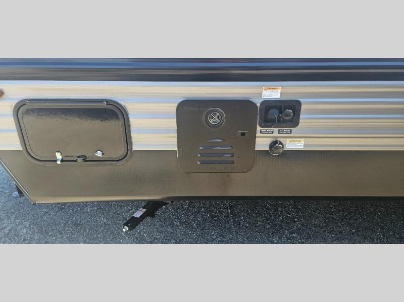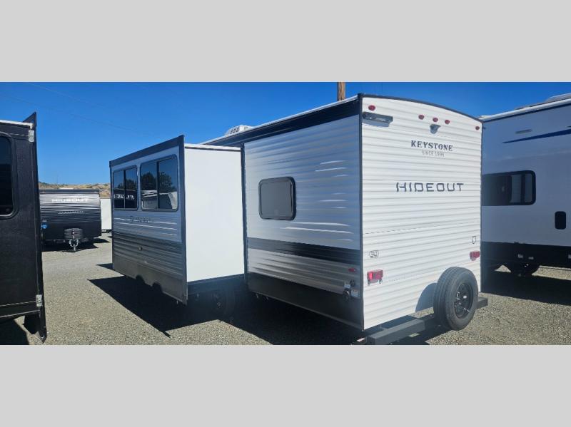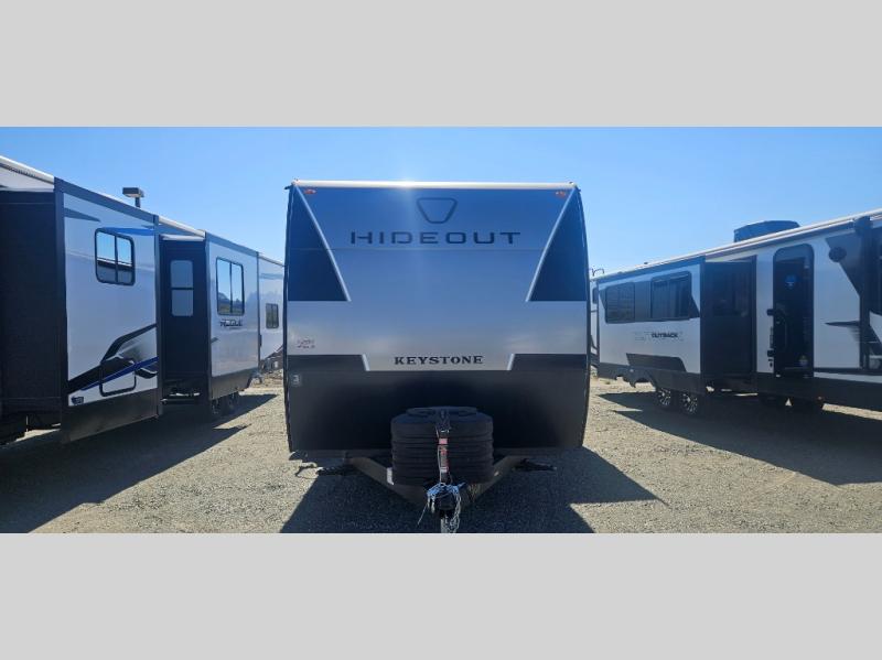 With any Hideout Sport travel trailer by Keystone you will enjoy simplified camping solutions that won't break the bank! Each model is constructed with a durable AlphaPly TPO roof membrane tinted safety glass windows, and an I-beam frame. There are power tongue jacks and heavy duty stabilizer jacks that will make it easier than ever to hitch up and go. An XL entry assist handle will also provide convenience, along with a power awning that will provide much wanted shade during the day. You will feel right at home with stylish decor, blackout night shades, and cozy bed with storage underneath!