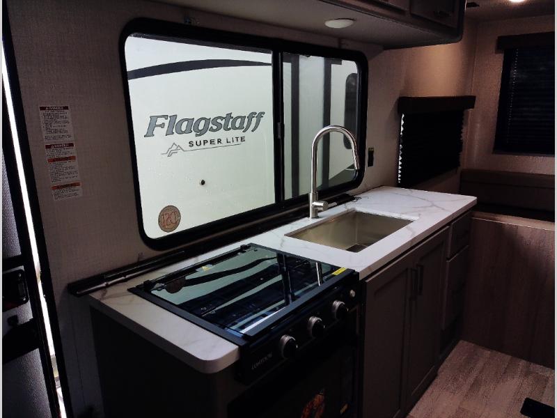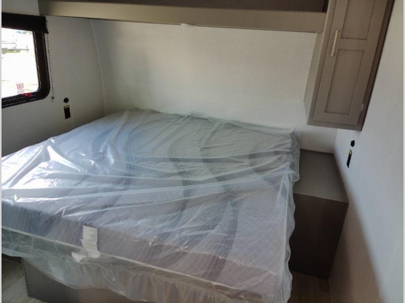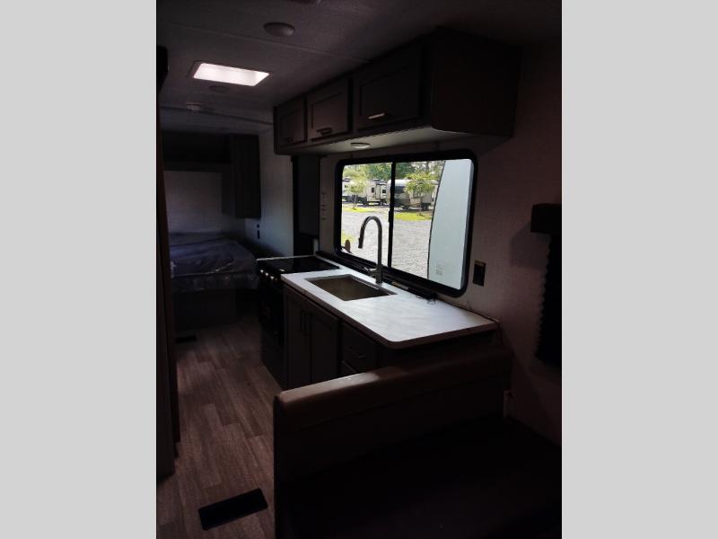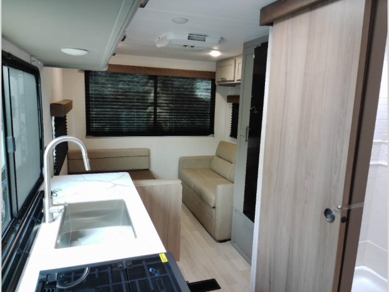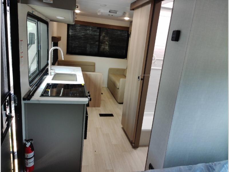 This is the perfect starter travel trailer since it includes everything you need while you're away from home. You'll enjoy the queen bed up front with underbed storage and nightstands for your things, plus a full bath on board so you won't have to use the camp's facilities. This model includes a cooktop that will allow you to cook meals each day, and there is a pantry and a 10 cu. ft. 12V refrigerator for food storage! A booth dinette in the back provides a place to dine and the sofa will be perfect to relax on after a day outdoors. And these pieces of furniture can double as your guests sleeping space at night!