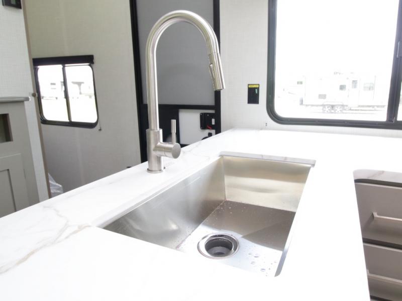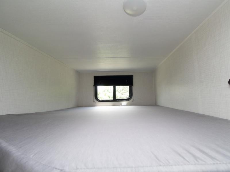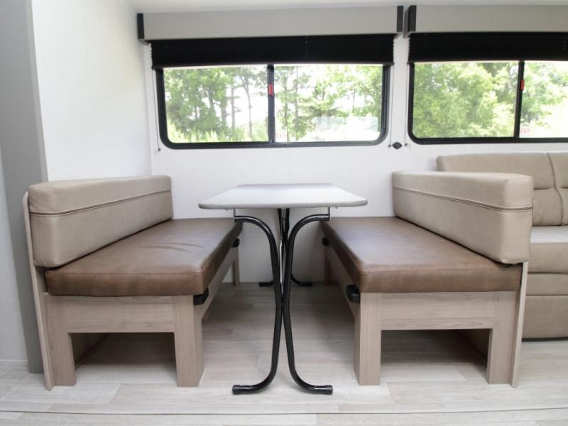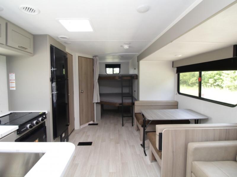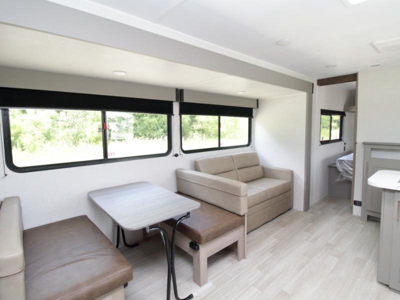 This model comfortably sleeps up to 10 people, thanks to the double-size rear bunks, a queen bed in the private front bedroom, and additional sleeping space on the booth dinette and sofa. The large slide-out creates an open living space, giving everyone room to stretch out after a day outdoors.