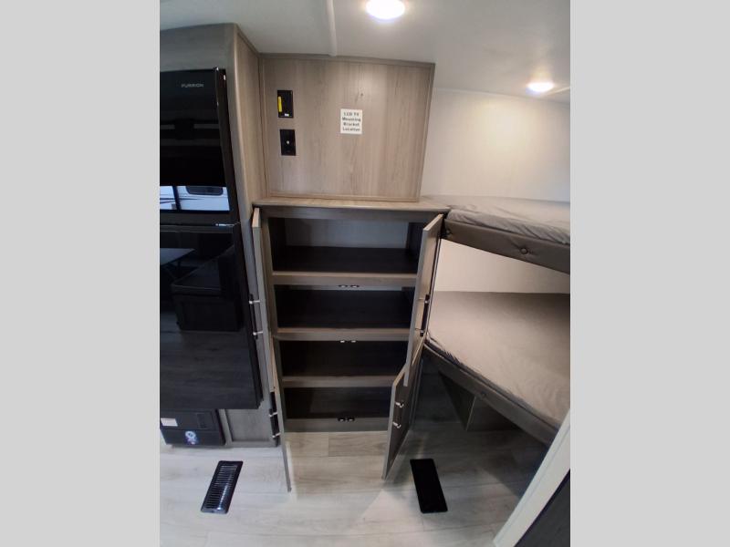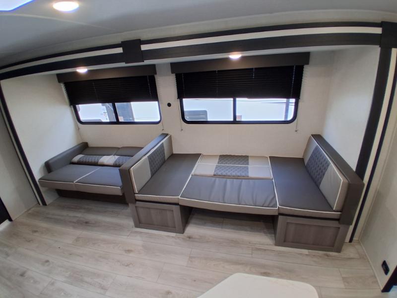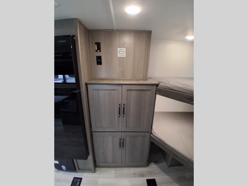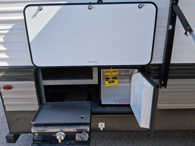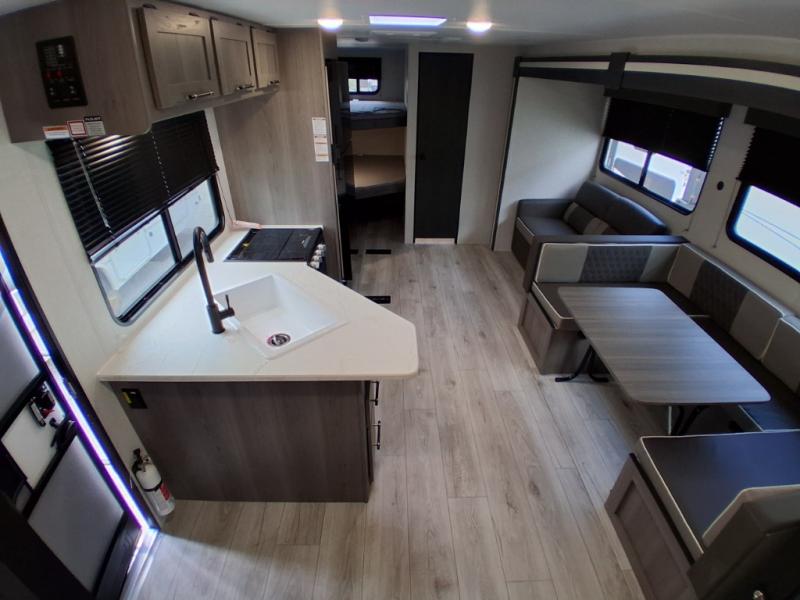A large slide, front private bedroom, and double-size bunks make this Hideout Sport Double Axle the ultimate travel trailer! You will enjoy a walk-around queen bed in the bedroom plus dual closets and nightstands for your things. The full bath is towards the back and beside the bunks for easy nighttime use, and there is a pass-through storage outside for your gear. Head to the kitchen to prepare lunch on the cooktop, then dine at the U-shaped dinette and sofa within the large slide. If the weather is nice, you might just want to cook outdoors on the outside kitchen under the 18' power awning!