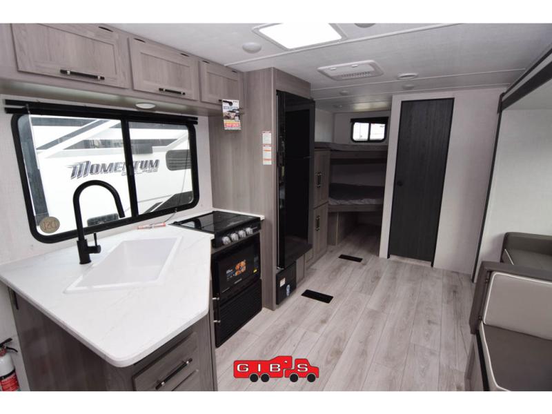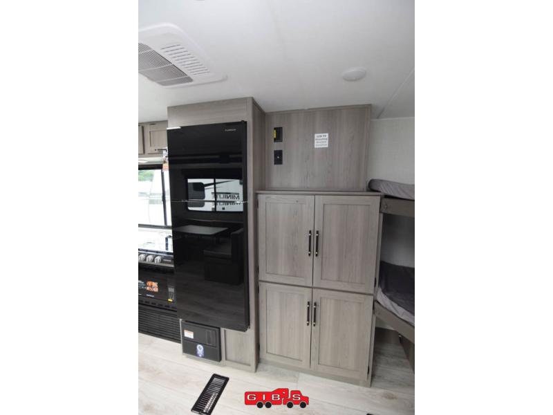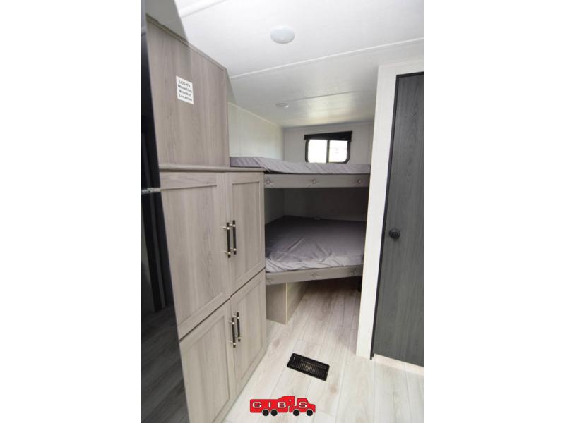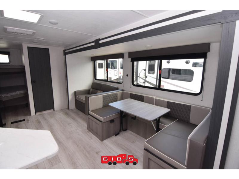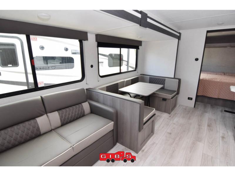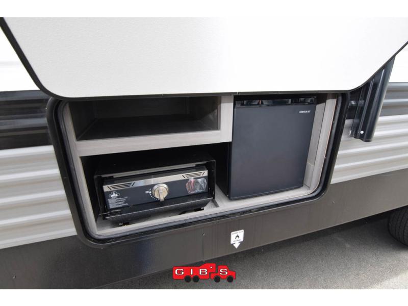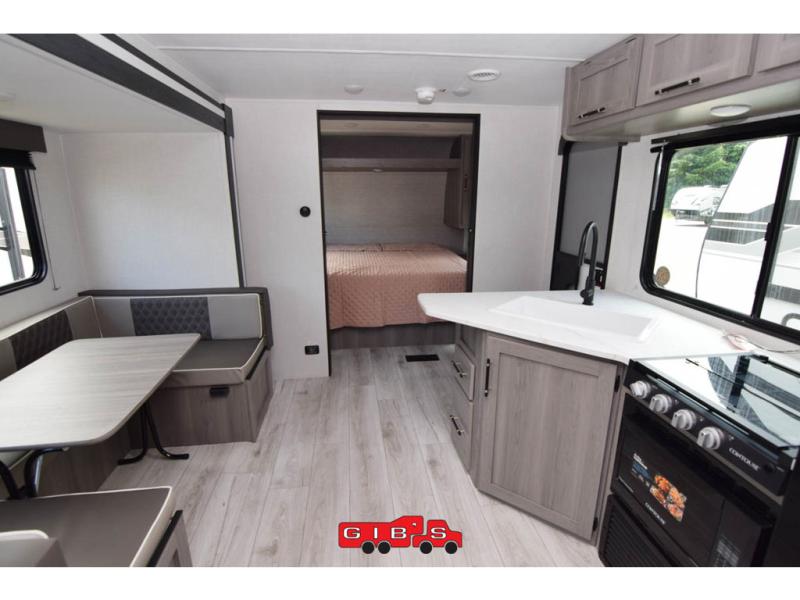 A large slide, front private bedroom, and double-size bunks make this Hideout Sport Double Axle the ultimate travel trailer! You will enjoy a walk-around queen bed in the bedroom plus dual closets and nightstands for your things. The full bath is towards the back and beside the bunks for easy nighttime use, and there is an outside kitchen to feed your whole crew. Head inside to prepare lunch on the cooktop if the weather isn't cooperating, then dine at the U-shaped dinette and sofa within the large slide.