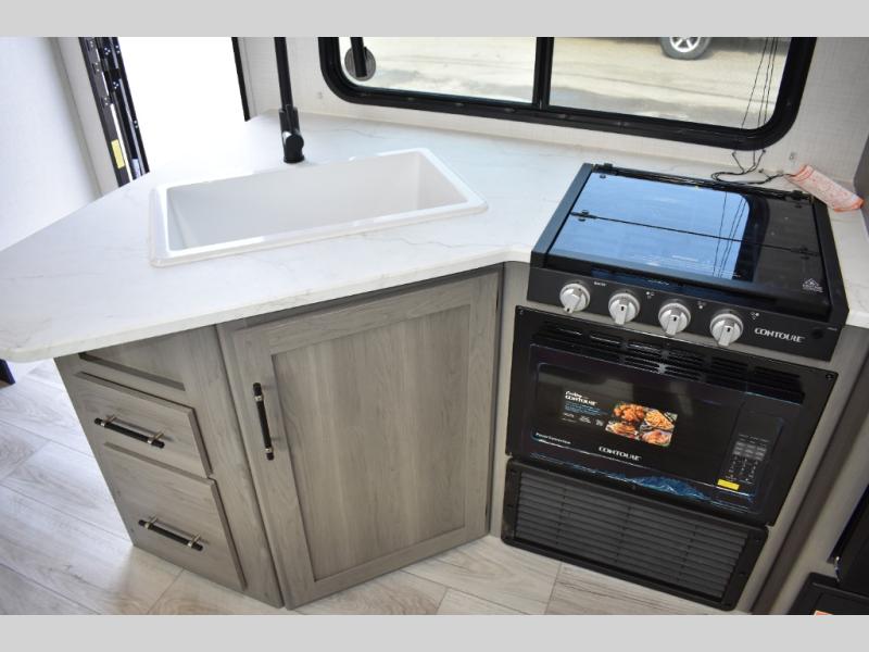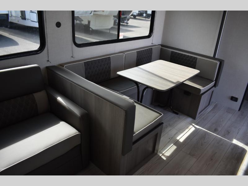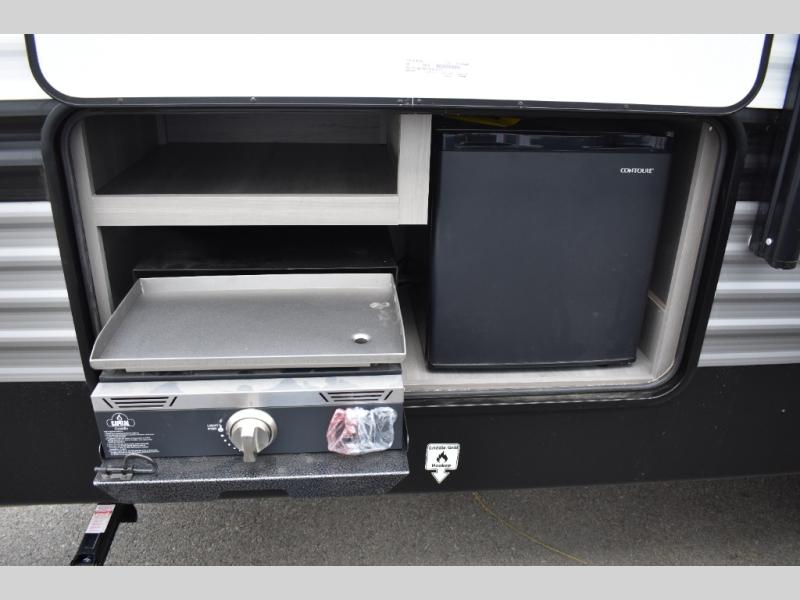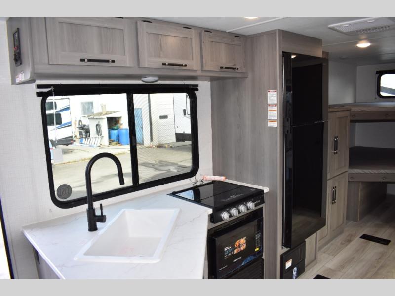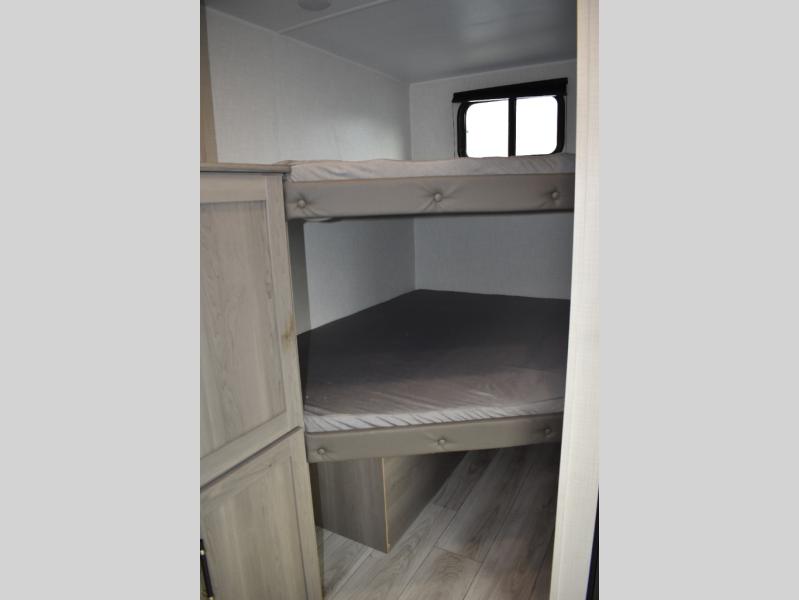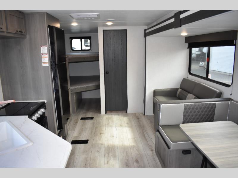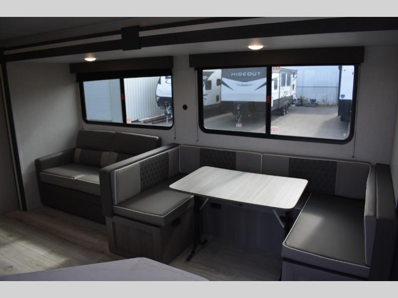 A large slide, front private bedroom, and double-size bunks make this Hideout Sport Double Axle the ultimate travel trailer! You will enjoy a walk-around queen bed in the bedroom plus dual closets and nightstands for your things. The full bath is towards the back and beside the bunks for easy nighttime use, and there is an outside kitchen to feed your whole crew. Head inside to prepare lunch on the cooktop if the weather isn't cooperating, then dine at the U-shaped dinette and sofa within the large slide.
