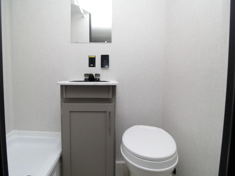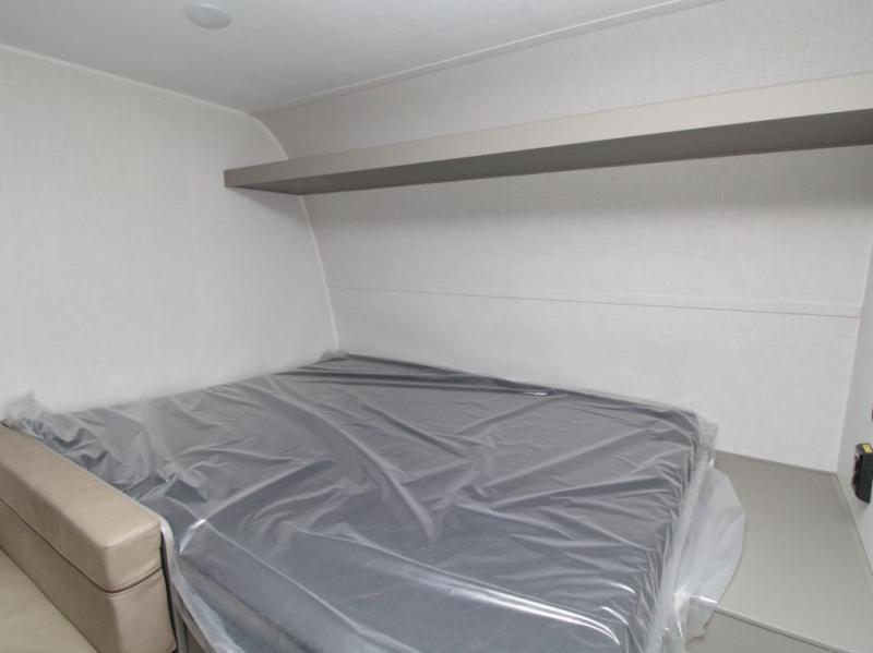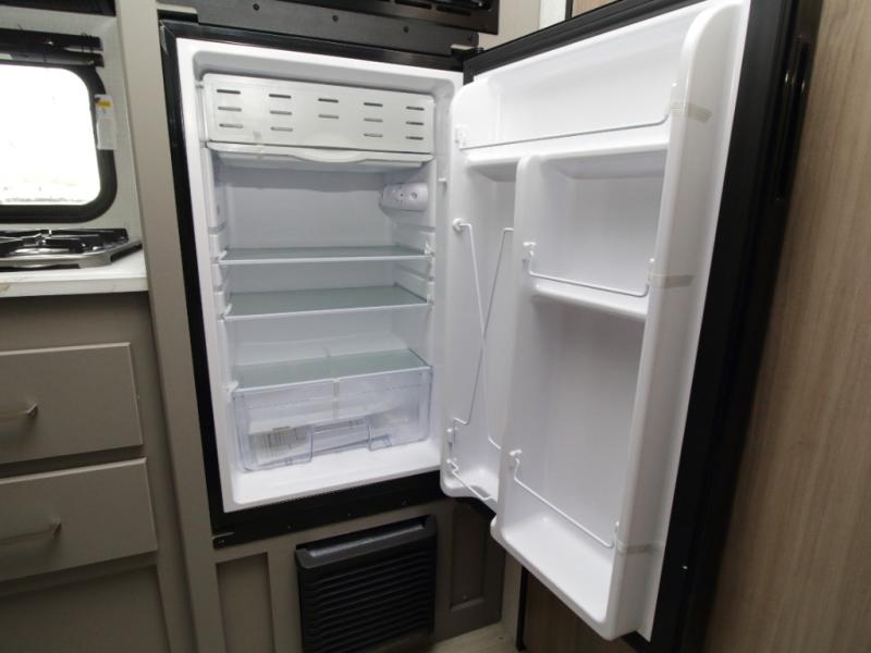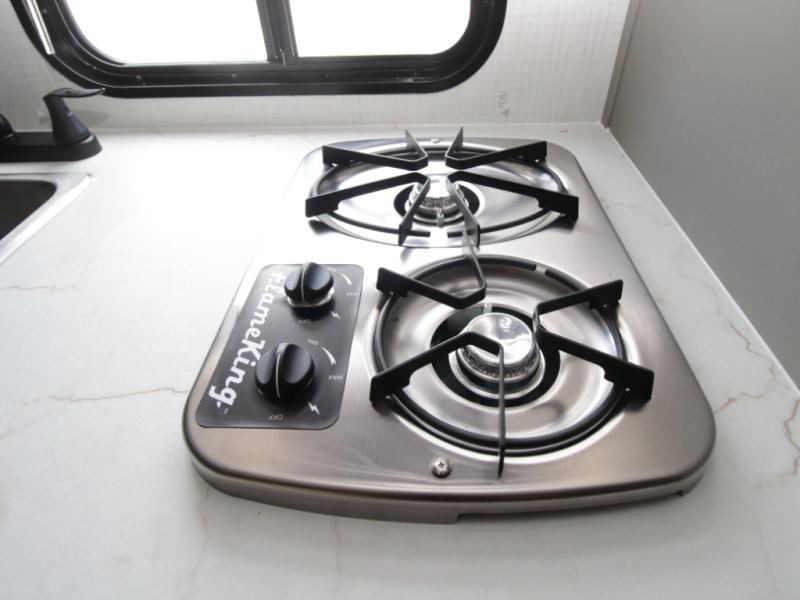 Meal prep is simple with the two-burner cooktop, 3.3 cu. ft. refrigerator, and overhead storage cabinets, while the full bathroom makes camping more convenient than ever. Store outdoor gear in the pass-through storage, then relax under the 10-foot power awning after a day of adventure.