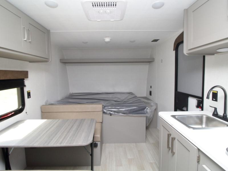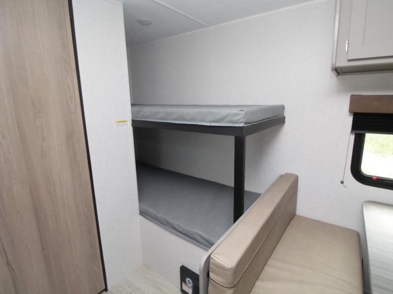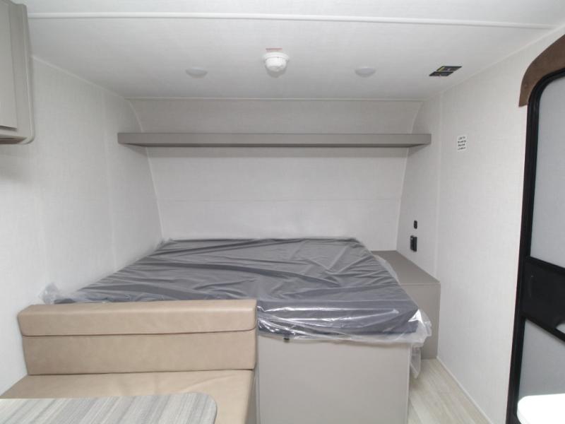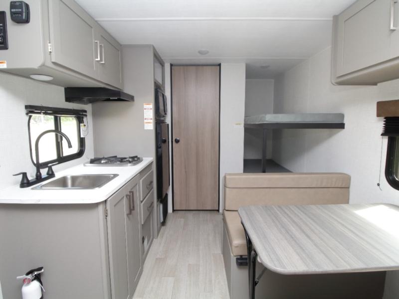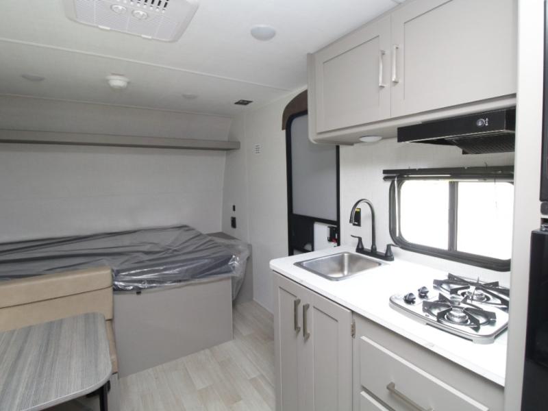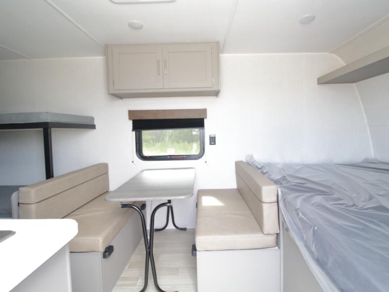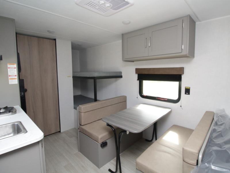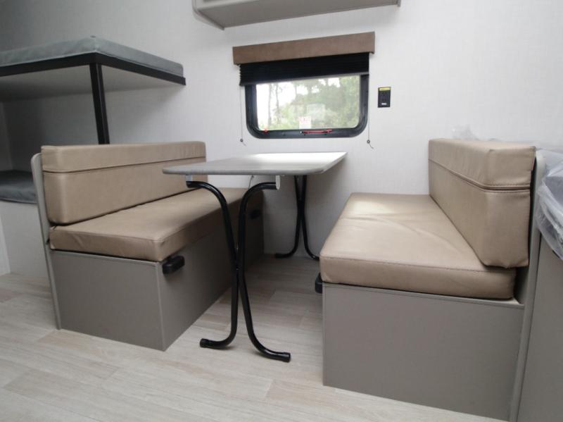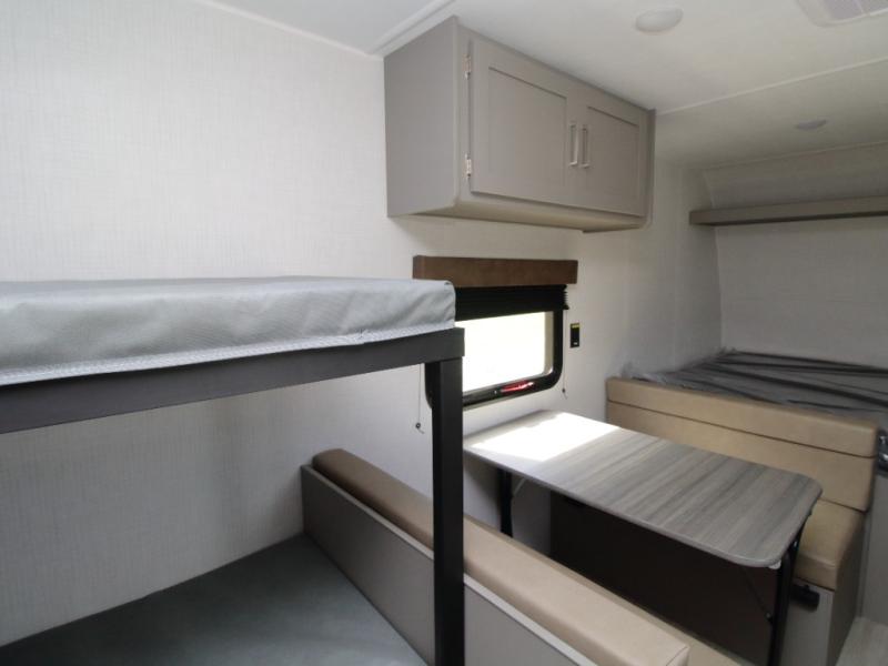 With sleeping space for up to five campers, this lightweight single-axle RV includes a front queen-size bed, rear corner bunks, and a convertible booth dinette for added versatility.