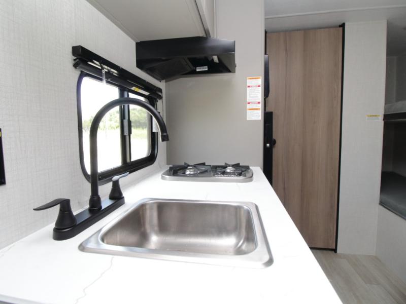 Each Keystone Hideout Sport Single Axle is designed for easy towing and long-lasting quality, featuring an aluminum exterior, Super Flex TPO roof membrane, and tinted safety glass windows. Inside, enjoy the comforts of solid wood cabinetry, blackout night shades, LED lighting, and a Girard tankless water heater for endless hot showers.