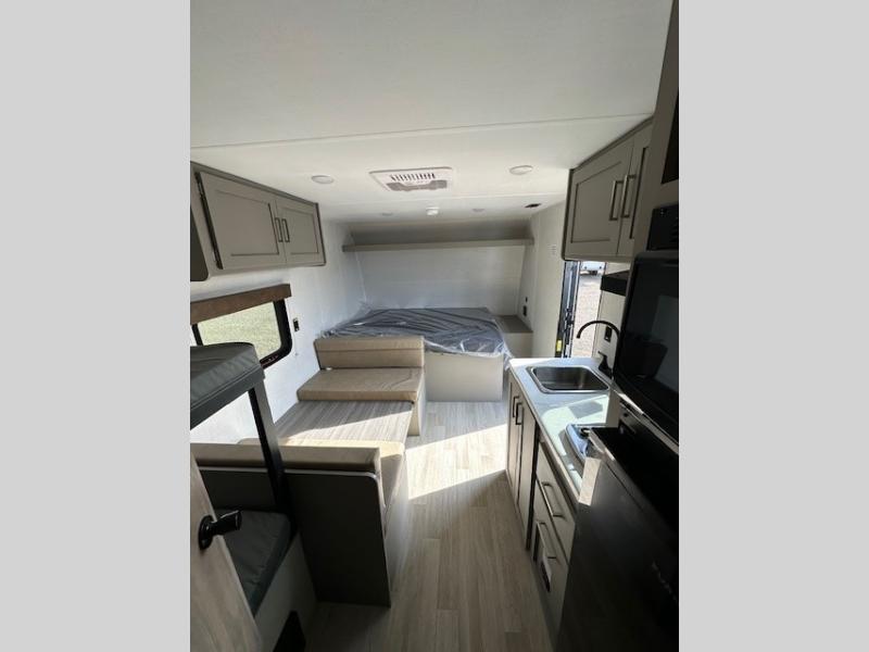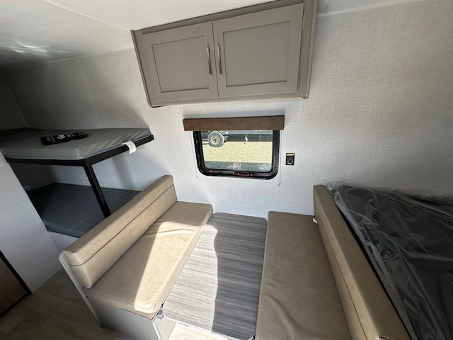This trailer will fit perfectly for a group of five or less thanks to all the sleeping space! The owners will have a queen-size bed, and others can choose between the rear corner bunk beds or the booth dinette once set up for bedtime. There is a full bathroom for convenience when changing and getting cleaned up, a galley kitchen with a two burner cooktop plus a 3.3 cu. ft. refrigerator for the cold items. And you can stow your larger camping items in the exterior pass-through compartment.