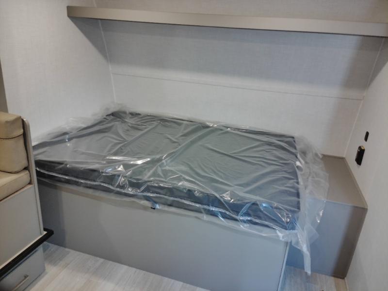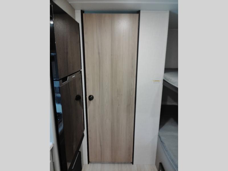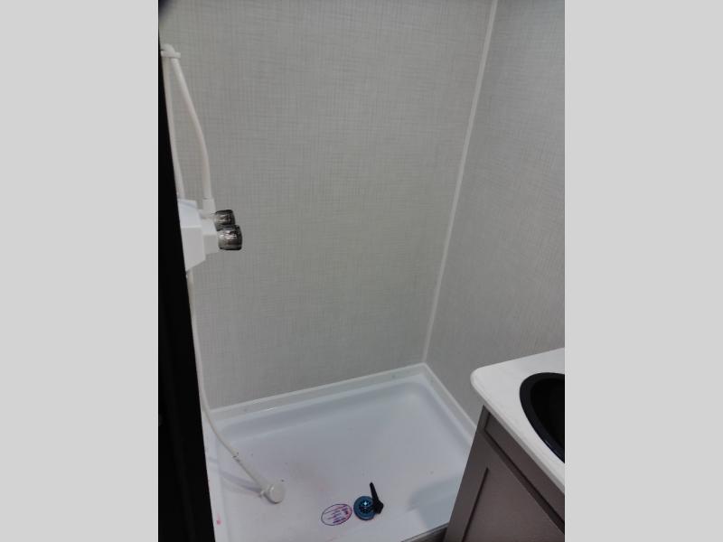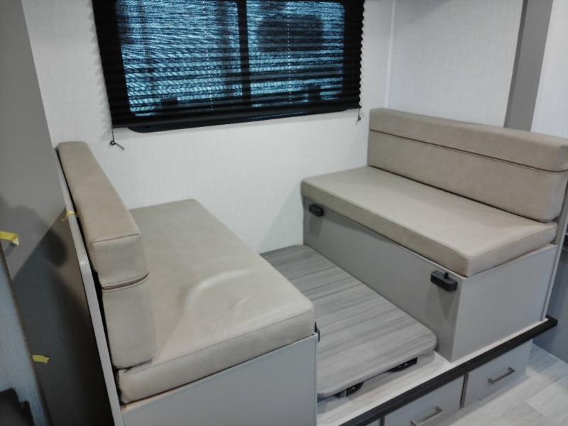 Step Inside this trailer where you can dine and relax on the slide out booth dinette which offers storage drawers below for your things. Everyone can take turns getting cleaned up in the full bathroom before falling asleep on the bunks, the queen-size bed or the booth dinette. The chef of your group will have a two burner cooktop to prepare meals and a 7.7 cu. ft. refrigerator for food storage. And the 10' power awning offers an outdoor living area protected from the elements once you add your camping chairs taken from the pass-through compartment.