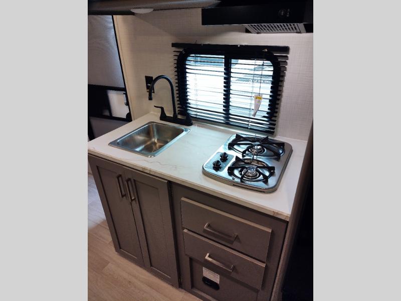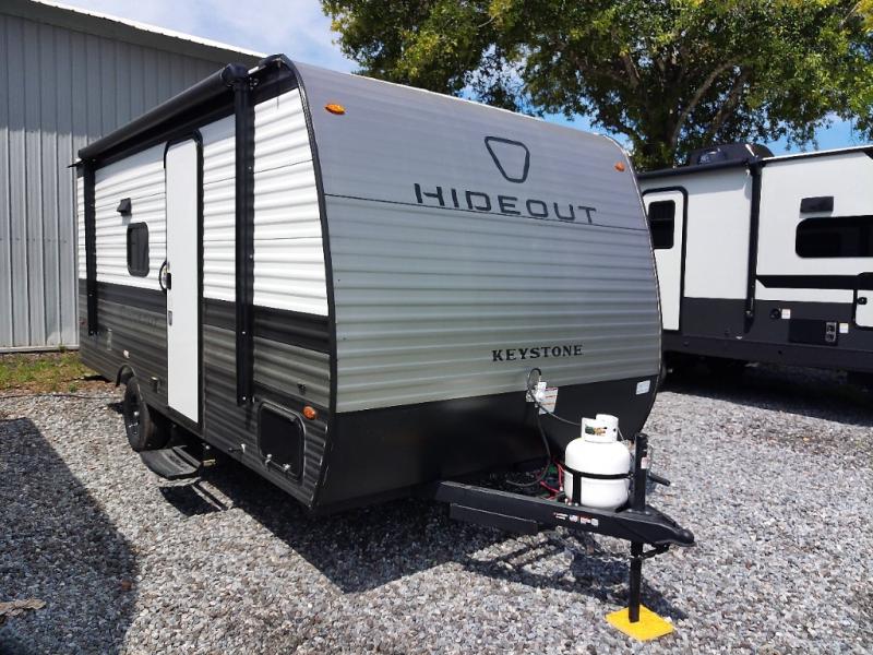 Open your horizons with the Hideout Sport Single Axle travel trailers by Keystone. They are compact, convenient, and lightweight; everything you're looking for in an RV! Each model features an aluminum exterior, tinted safety glass windows, and a Super Flex TPO roof membrane for added durability. The interior includes blackout night shades for added privacy and solid wood doors and drawers that will give a more at-home touch. The Girard tankless water heater is a feature you won't want to camp without, and the LED lighting will keep your space bright and open!