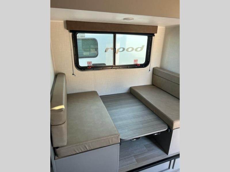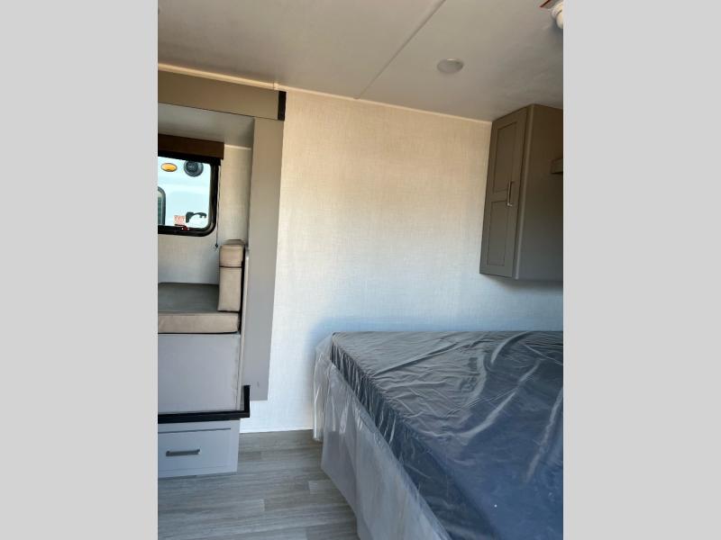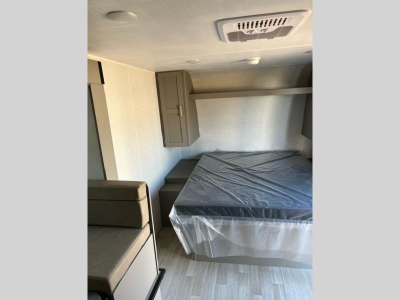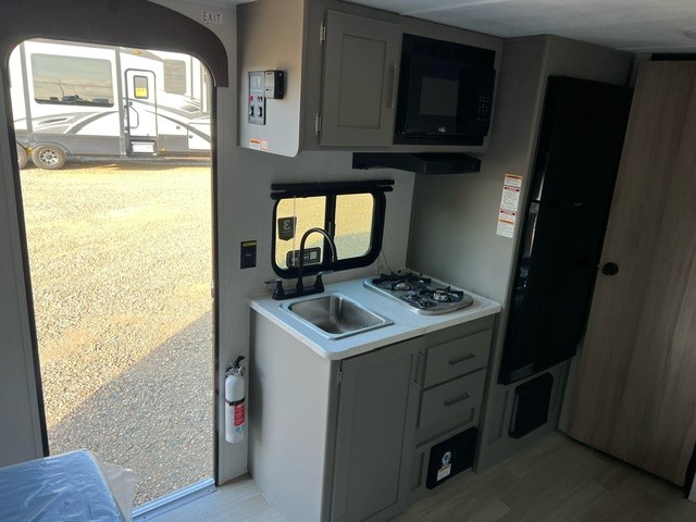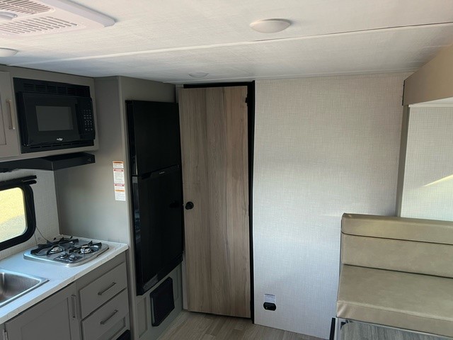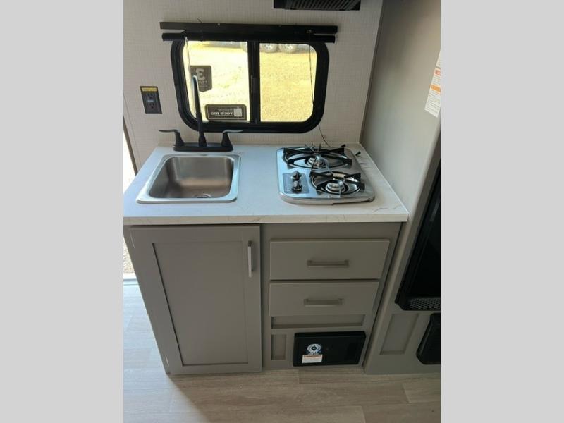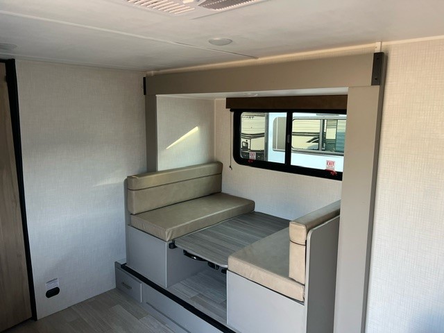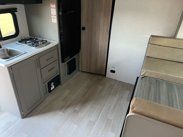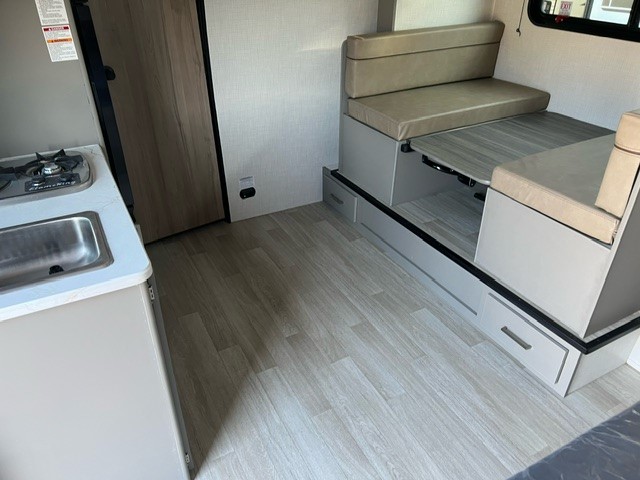 It's time to enjoy the great outdoors with family and friends at the campgrounds you like to meet everyone at! This trailer will allow three to four to camp comfortability with amenities such as a two burner cooktop, a 7.7 cu. ft. refrigerator, and a spacious rear full bathroom. The booth dinette slide offers a place to dine, read a book and even provides sleeping space and storage drawers for board games or throw blankets. The slide gives the interior more floor space as well. This model also includes a walk-around queen bed that will make your space feel a little more like home!