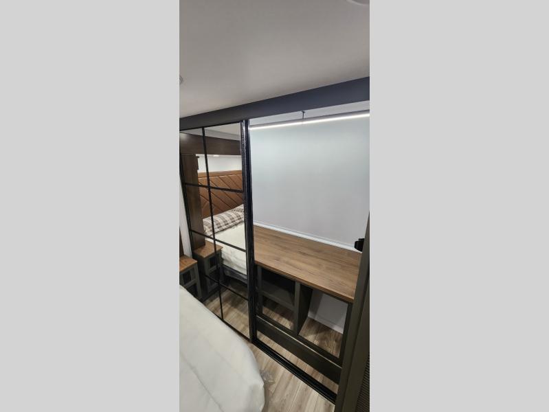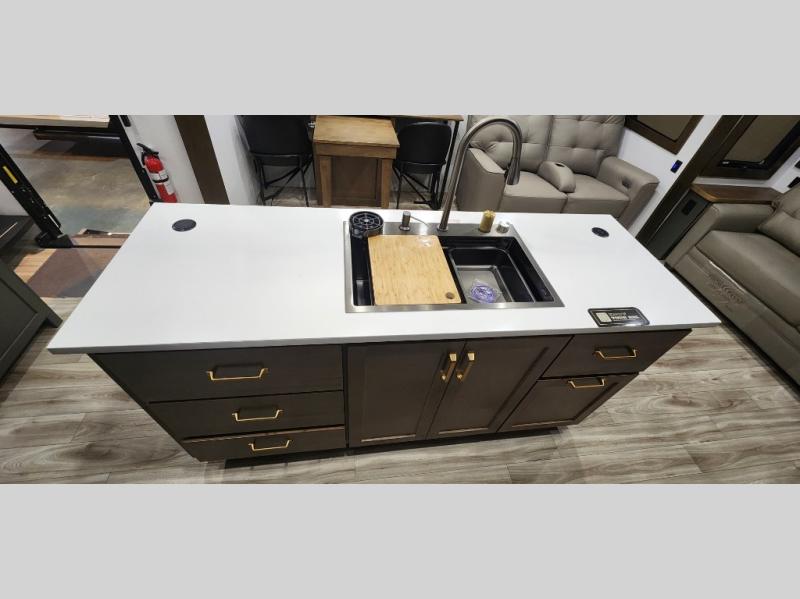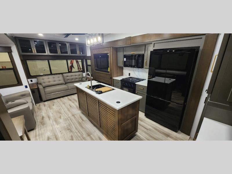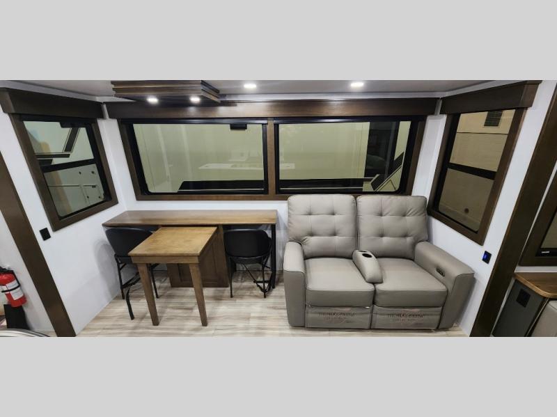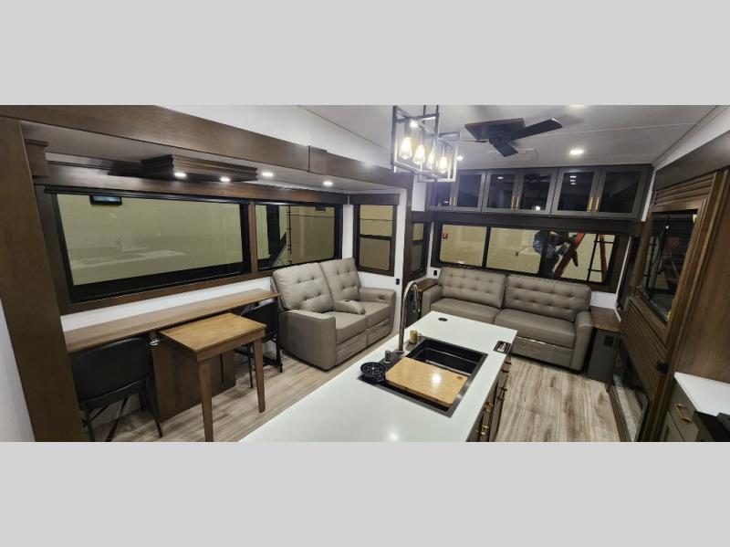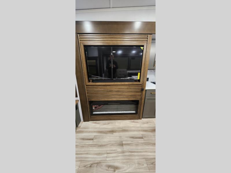 You'll love camping in this fifth wheel with a rear living room and triple slides for ample interior space! The sofa, theater seating, and adjustable sliding 'Deskette" with chairs will provide comfortable seating, dining, and working space, and the entertainment center with a fireplace will make it feel more like home. A large kitchen island gives you more counter space when making meals in the full kitchen, and the spacious full bath is a comfort you won't want to camp without. Up front, you'll find a private bedroom with a king bed slide, storage space and TV prep if you want the option to watch movies in bed.