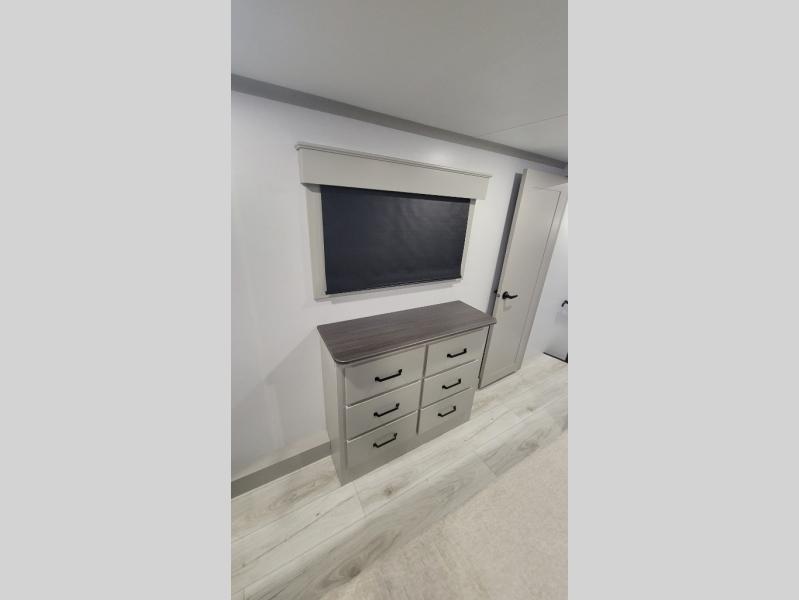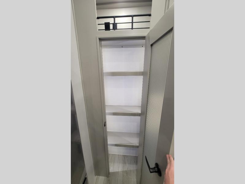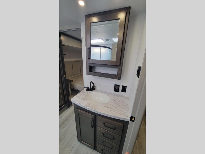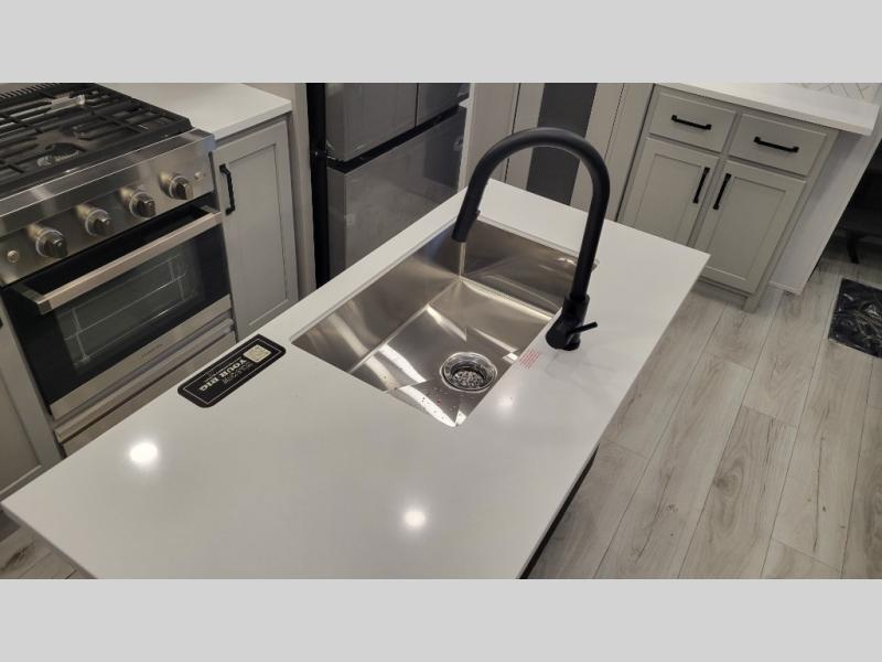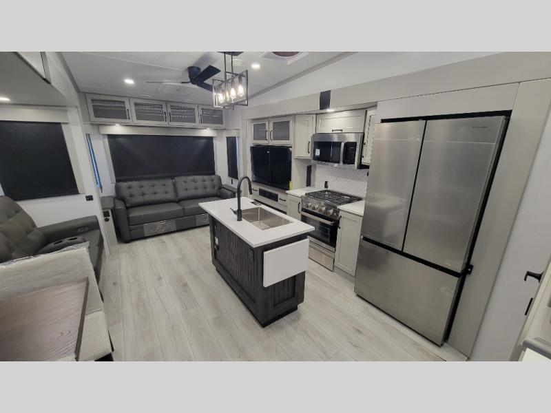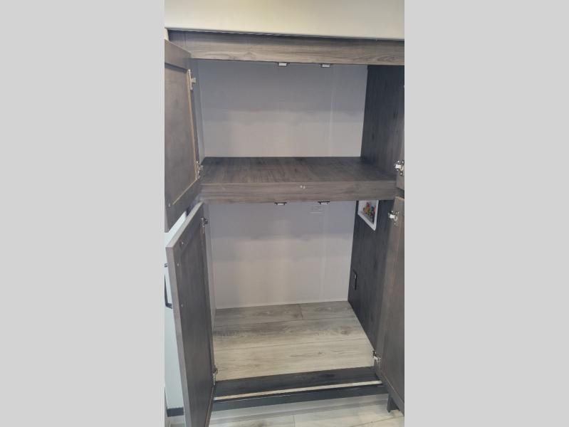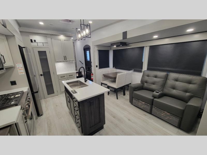 You can take this Montana High Country fifth wheel to the campsite of your choice! You'll have plenty of comfort with the king-size bed in the front master suite, and you can also let some friends or kids sleep on the hide-a-bed sofa in the rear living area. While you watch the 50" TV, you can sit back in the power theater seating, and you can switch on the fireplace for some added heat if it's cool outside. The opposing slides in the main living area are what give you extra space to work freely around the kitchen island, and the coffee station allows you to prepare your afternoon pick-me-up with all of your coffee essentials sitting in one place just like at home.